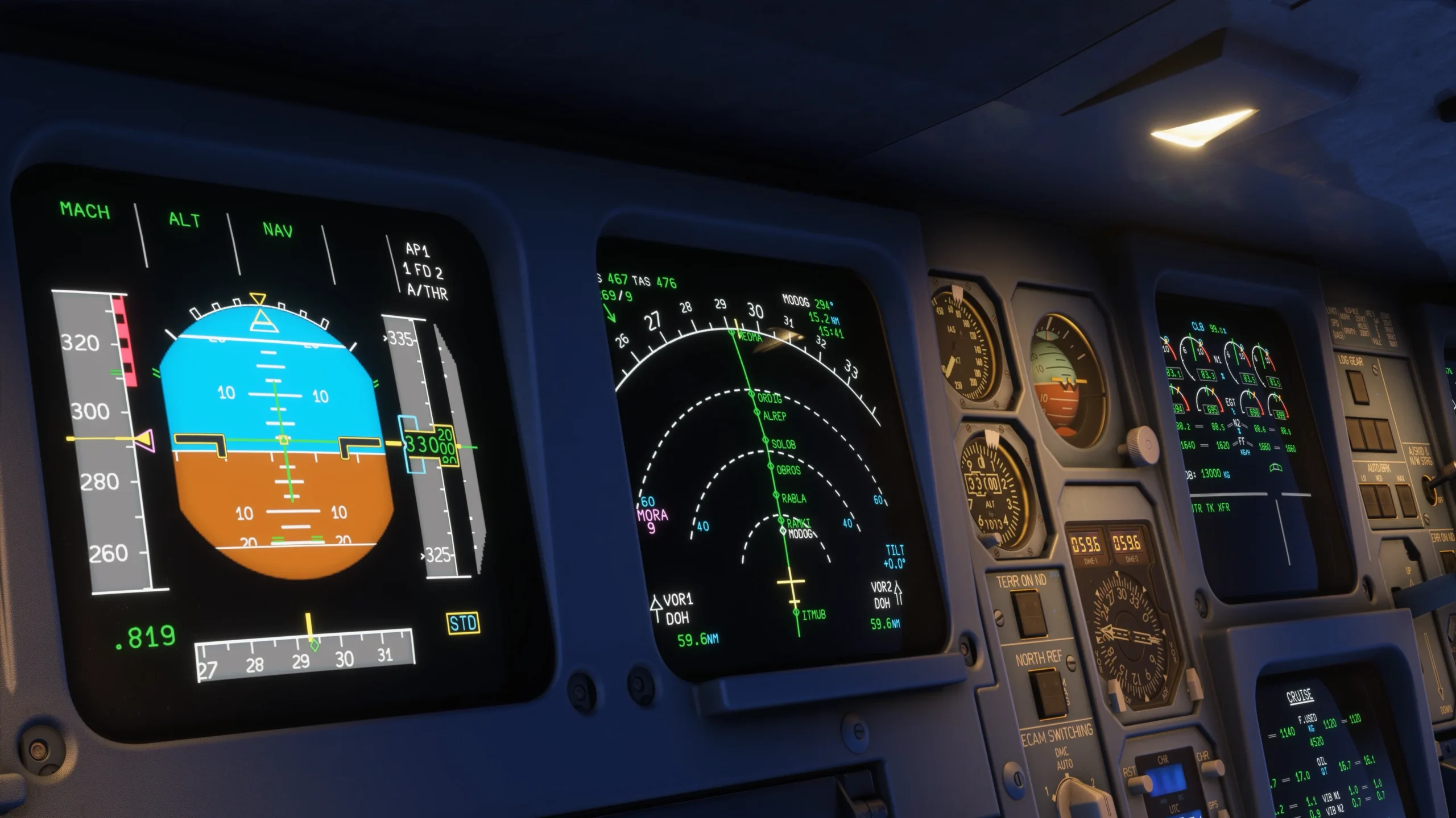 - FMS Detalhado: Totalmente customizado, com suporte a SIDs, STARs, planos de voo secundários e um sistema LNAV/VNAV avançado.