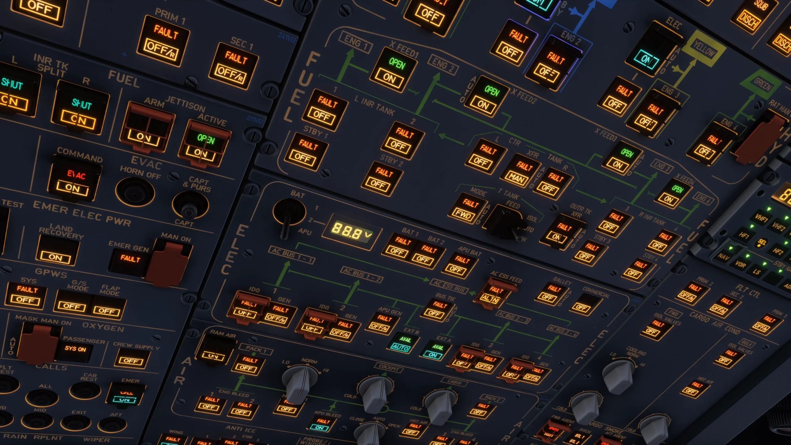 - ECAM e Falhas: Mais de 100 páginas do ECAM foram modeladas, com a possibilidade de falhas dinâmicas como bird strikes e interferência de GPS (GPS jamming).