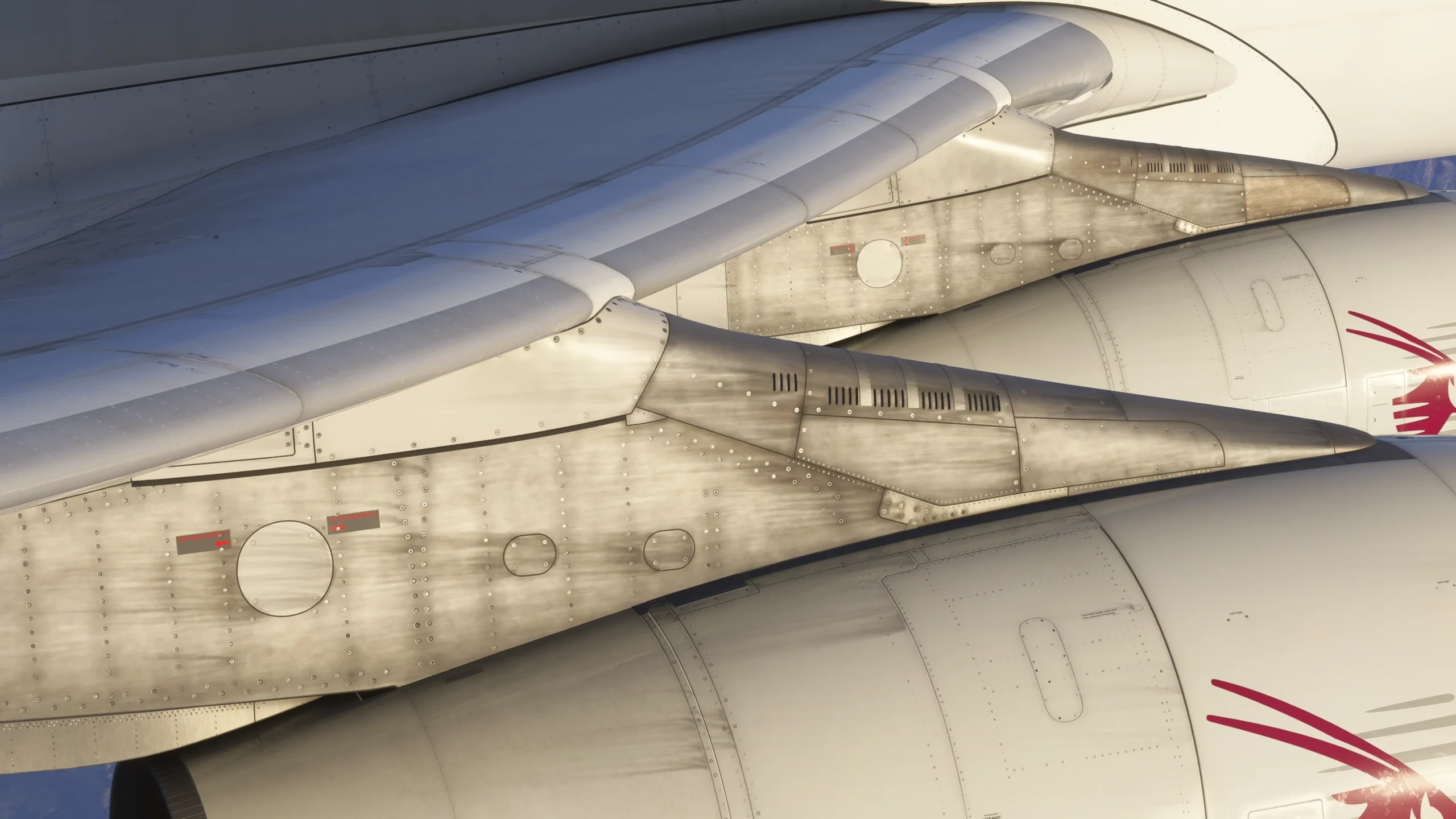 Em vez de entregar um jato com aparência de “saído da fábrica”, a direção visual do iniBuilds A340 reflete uma aeronave com mais de 20 anos em serviço ativo. Isso se traduz em manchas de óleo hidráulico, desgaste nos painéis e remendos de manutenção, conferindo um nível de autenticidade raramente visto.