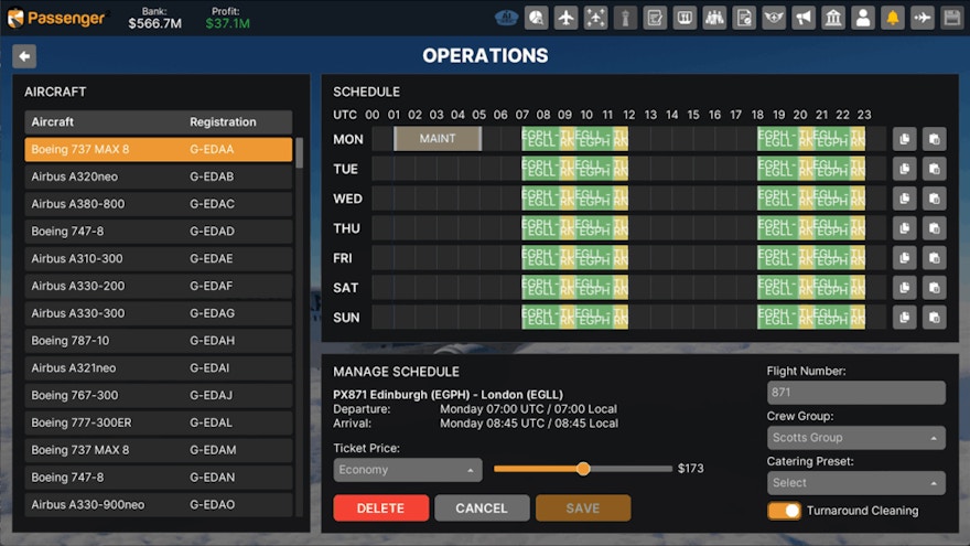 Outra novidade importante é o novo sistema de gerenciamento de horários, que estava prometido para um lançamento separado em junho, mas acabou sendo incluído já neste update. Agora é possível clicar, arrastar e redimensionar blocos de voo diretamente na grade de schedule, com cálculo automático de turnaround, preenchimento automático de números de voo e agendamento de manutenção com um clique, deixando o planejamento de malha muito mais visual e intuitivo.