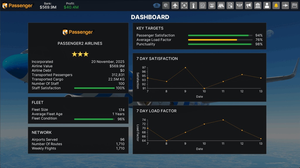 A área de gerenciamento da companhia aérea foi redesenhada com um layout mais limpo e espaçoso, aproveitando até 85% da tela do monitor e com redimensionamento adaptativo. Saldo, lucro mensal e demais indicadores financeiros agora aparecem em formato mais claro, facilitando a leitura rápida de resultados sem precisar caçar números em tabelas apertadas.
