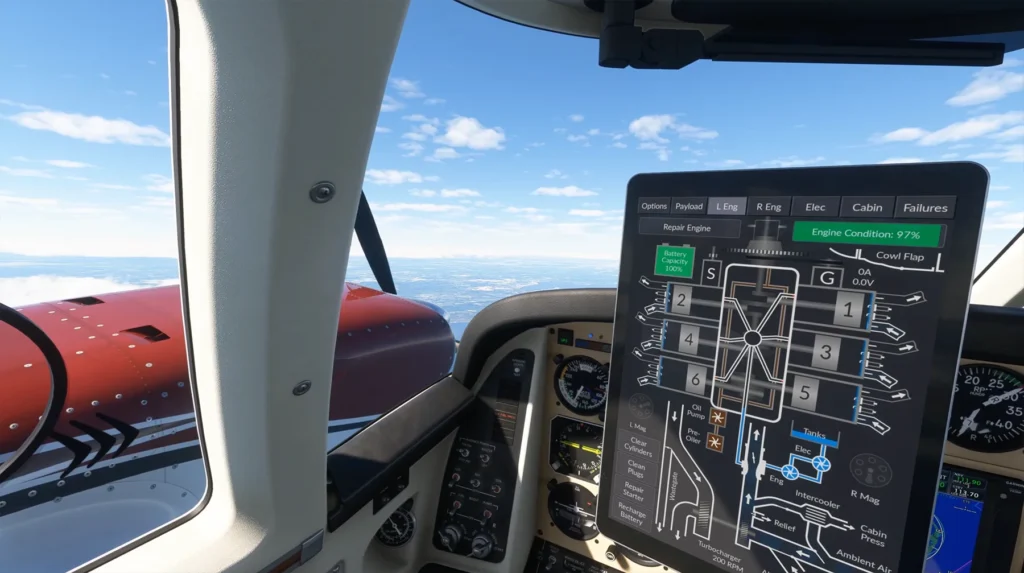 A atualização v1.2 não apenas garante compatibilidade plena com o Microsoft Flight Simulator 2024, como também traz uma série de novidades que elevam a imersão. Uma das maiores inovações é o novo sistema interativo de inspeção pré-voo e walk-around, onde agora é possível interagir com calços, capas de pitot, portas de bagagem e outros equipamentos em solo diretamente no simulador.