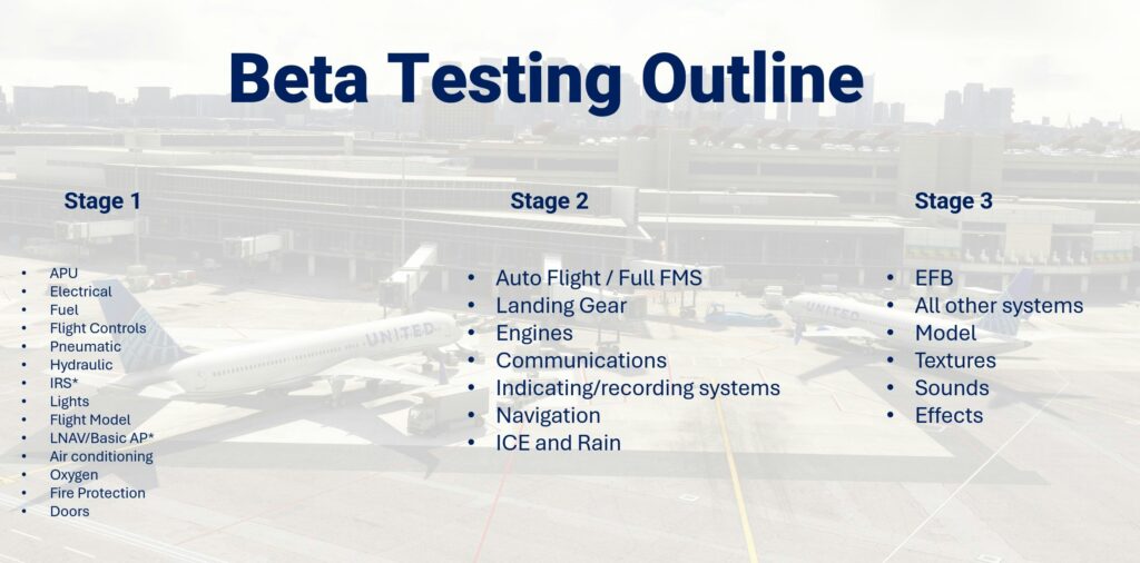 De acordo com a equipe da BlueBird Simulations, o estágio atual é considerado o primeiro de três da fase beta. Embora alguns possam ver esse estágio inicial como uma “late alpha”, por conta de sistemas ainda não concluídos, já há testadores externos envolvidos. Os principais objetivos agora são coletar feedback e realizar ajustes necessários, levando a simulação do Boeing 757 ao próximo nível.
