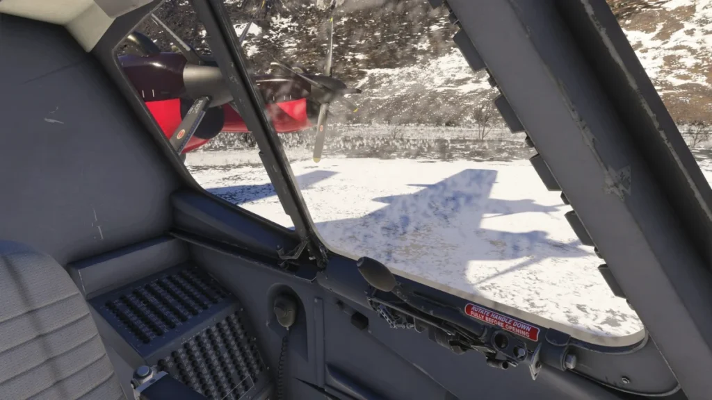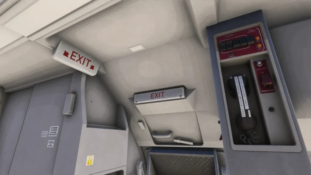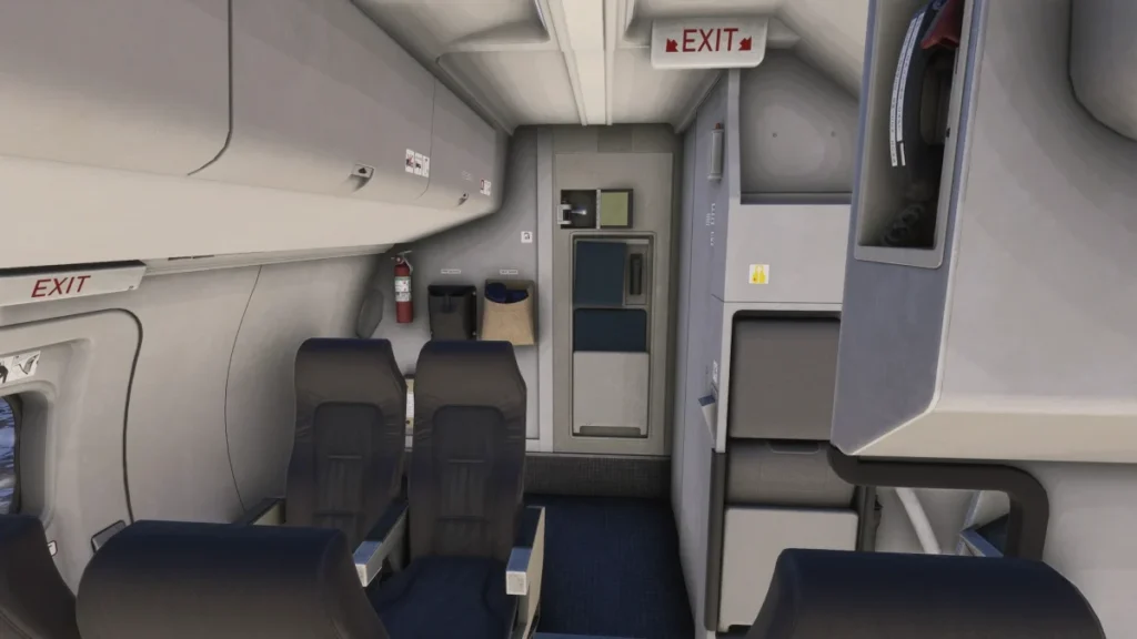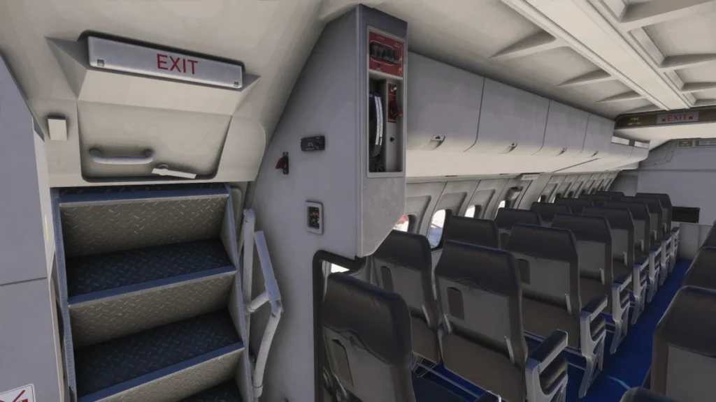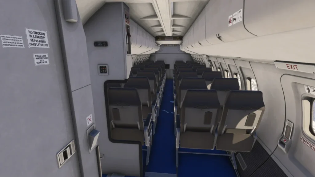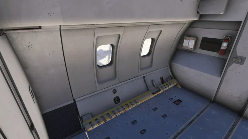 Na versão cargo-only, o interior aparece totalmente despojado, sem assentos, com o piso de carga exposto de ponta a ponta. Já a cabine de passageiros mostra painéis superiores modelados, sinalização de emergência, galleys e acabamento mais caprichado que o da v1. Para quem gosta de operar voos regionais em pistas curtas, especialmente em cenários remotos, essa flexibilidade de configuração abre espaço para operações bem variadas dentro do MSFS 2024.