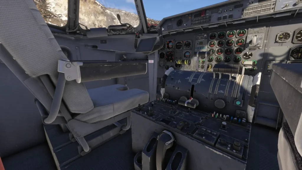O cockpit também recebeu atenção visível. As screenshots mostram um painel analógico bem carregado, com instrumentos clássicos, marcas de uso, variação de materiais e superfícies que finalmente parecem condizentes com o nível visual atual do MSFS 2024. Não há detalhes oficiais sobre profundidade de sistemas, mas o layout sugere uma abordagem mais séria do que a vista na primeira versão, que foi alvo de críticas justamente em flight model e simulação de sistemas.