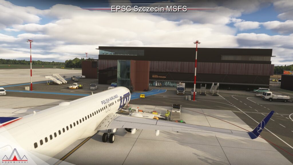 O grande destaque do pacote é a representação completa do layout atual de EPSC, com pátios, taxiways, stands e infraestrutura compatíveis com o sistema de AI traffic e ATC do MSFS. A Drzewiecki também incluiu o novo terminal previsto para 2027, modelado com base em plantas arquitetônicas e visualizações oficiais, o que dá ao cenário um ar de “futuro próximo” interessante para quem gosta de voar em ambientes atualizados.
