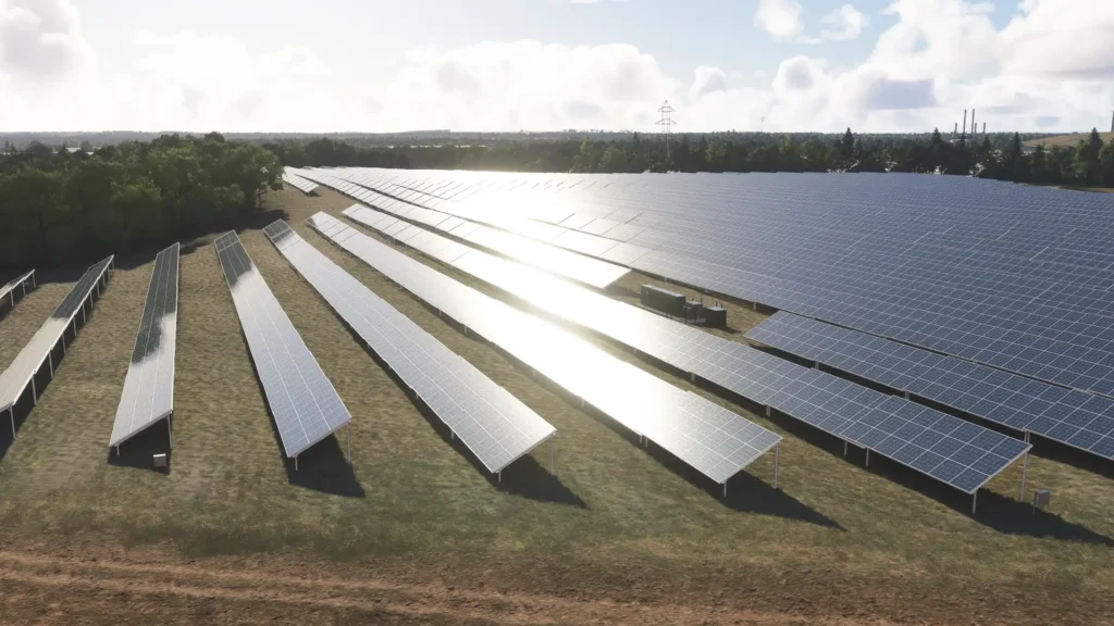 Além das texturas, a desenvolvedora modelou com precisão todos os componentes que compõem uma fazenda solar: os próprios painéis, inversores, subestações e cercas de segurança. Cada detalhe foi pensado para garantir a máxima fidelidade visual sem comprometer o desempenho.