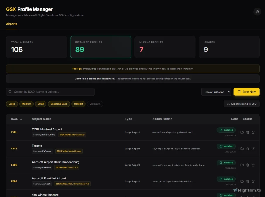Na prática, isso transforma a tarefa de “caça a perfis” em um fluxo contínuo: você roda o scan, vê a lista de aeroportos sem perfil, clica, cai na página certa do FlightSim.to e decide se vale baixar algo existente ou até criar o seu. Para quem gosta de manter uma coleção bem curada de hubs com GSX refinado, essa integração reduz bastante o atrito e incentiva a manter tudo em dia, em vez de deixar para depois.