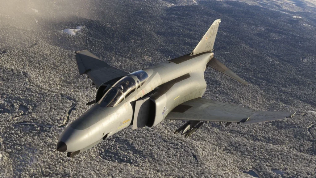 Externamente, o Phantom mantém a silhueta agressiva que o tornou ícone da aviação militar, com modelagem detalhada de superfícies móveis, entradas de ar e armamentos inertes. A iluminação do MSFS trabalha bem com o modelo, reforçando volumes e ressaltando o trabalho de normal maps e materiais metálicos, algo que deve ficar ainda mais evidente em condições de pôr do sol e clima dinâmico.