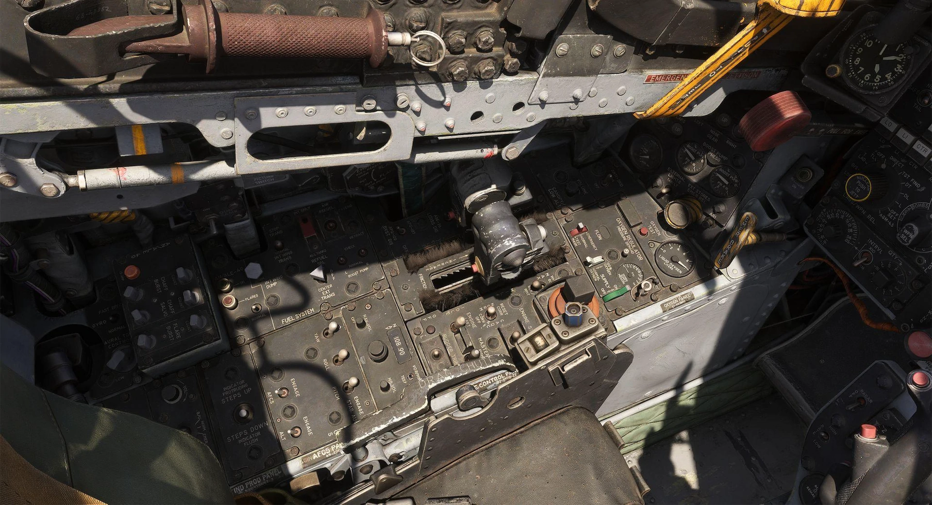 Os screenshots divulgados chamam atenção principalmente pelo interior. O cockpit do F-4E aparece com um nível de desgaste, sujeira e variação de materiais que foge do padrão “limpo de fábrica” comum em muitos addons militares. Etiquetas desbotadas, pintura descascando, plásticos marcados pelo tempo e metal polido pelo uso ajudam a vender a ideia de um jato que voou duro por décadas, e não de um protótipo de museu recém-restaurado.