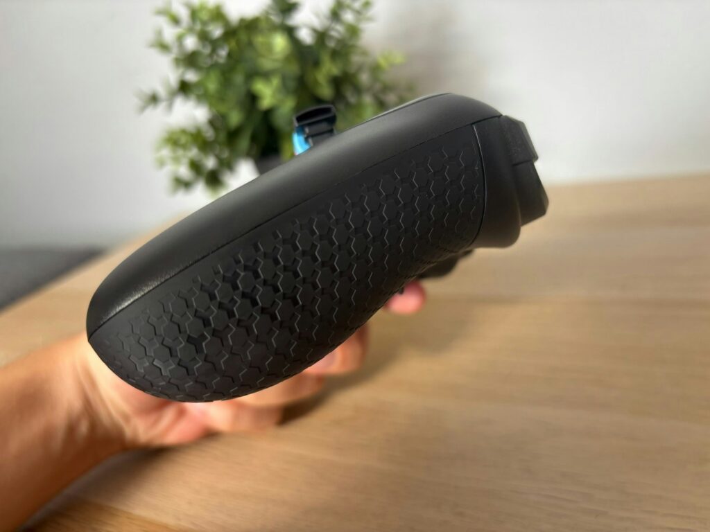Na mão, o Echo lembra um controle de console moderno, com pegada confortável e boa distribuição de peso graças à bateria interna e ao módulo wireless. O grip traseiro texturizado ajuda em sessões longas, e todos os botões principais ficam ao alcance de mãos médias sem contorcionismo. Não chega ao nível de refinamento de um controle de Xbox, mas está bem acima de gamepads genéricos que muitos simmers acabam usando por falta de opção dedicada.