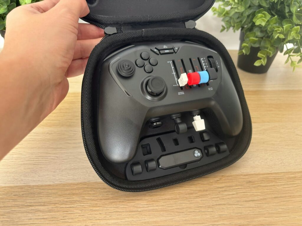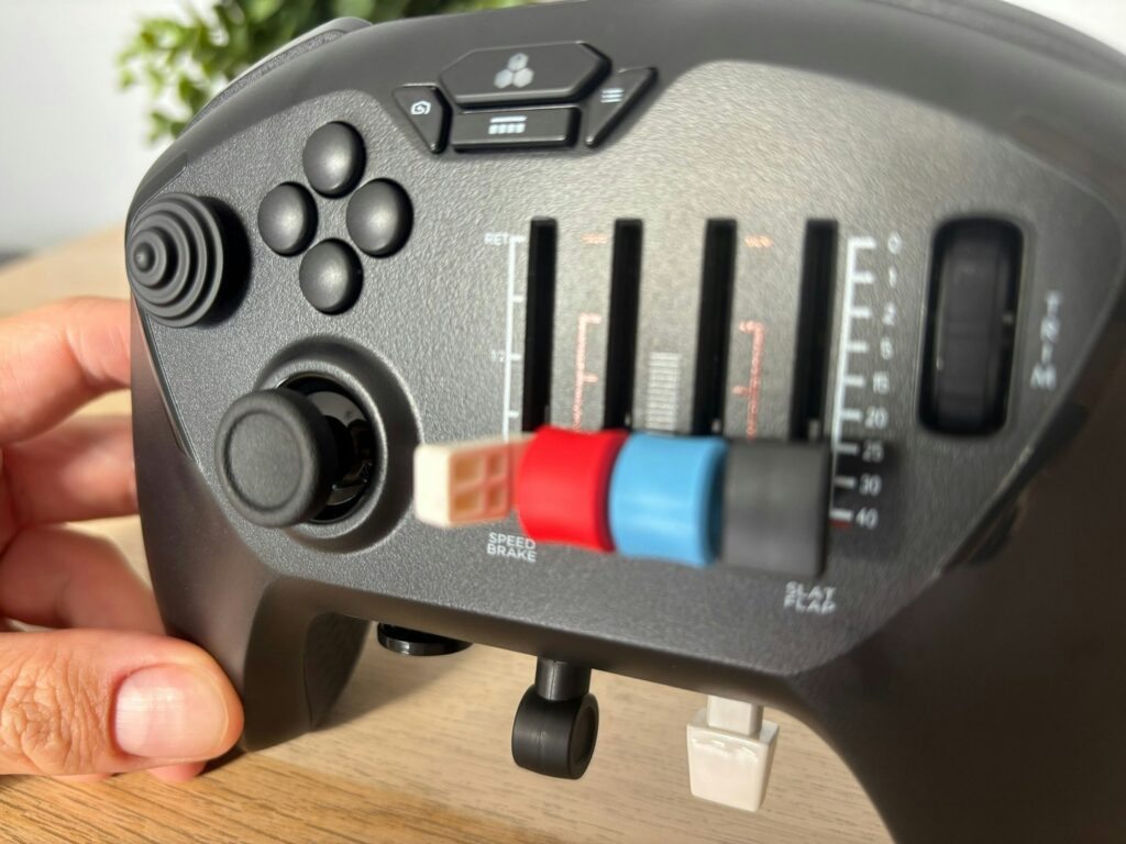 O charme extra fica por conta das peças intercambiáveis que mudam o “tema” do controle entre GA, Airbus e Boeing. A mudança é mais estética do que funcional, mas o formato de cada módulo ajuda a entrar no clima do tipo de voo: um layout mais “Airbus” para voar A320 no MSFS, outro mais “Boeing” para 737, e assim por diante. É um toque simples, porém bem pensado para quem gosta de imersão sem partir para hardware pesado.