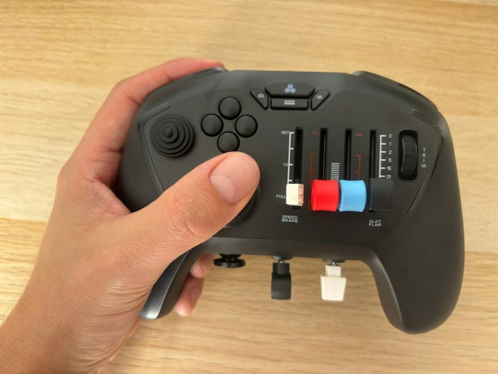 O peso, que nos primeiros protótipos parecia leve demais, agora está no ponto: sólido, sem sensação de brinquedo barato. O ponto mais polêmico é o stick de câmera no estilo “pirâmide”, herança do Alpha Flight Controls. Ele funciona, mas o formato pontudo e a posição pouco ortodoxa cansam e destoam do resto do design, que é bem mais moderno e intuitivo.