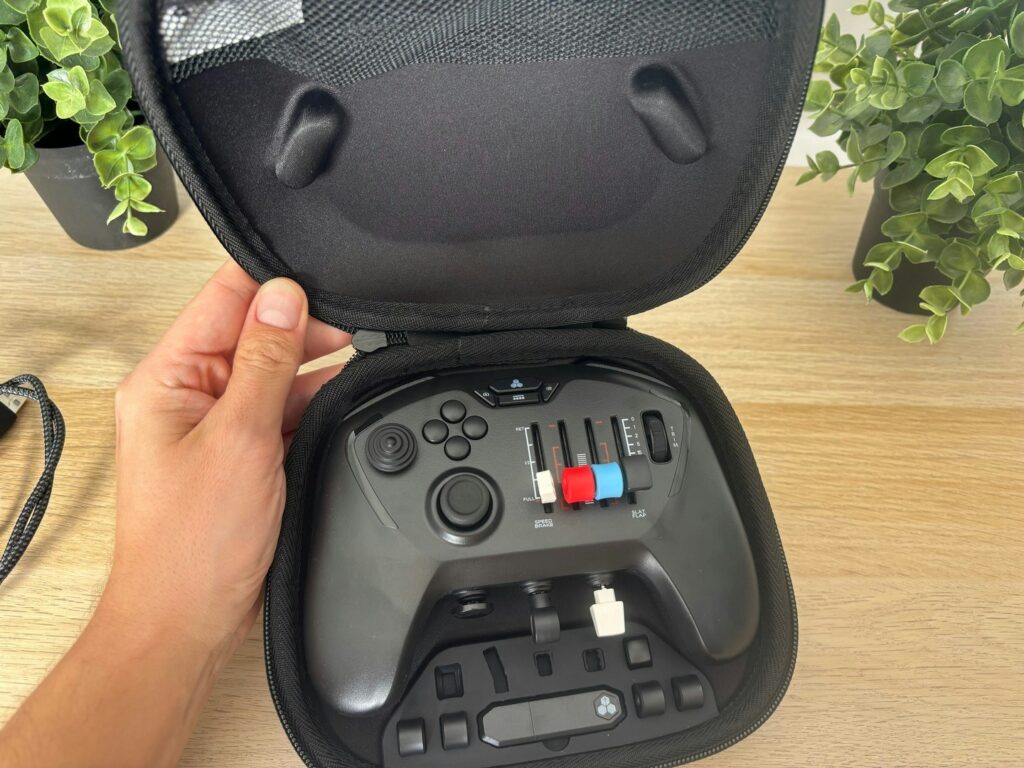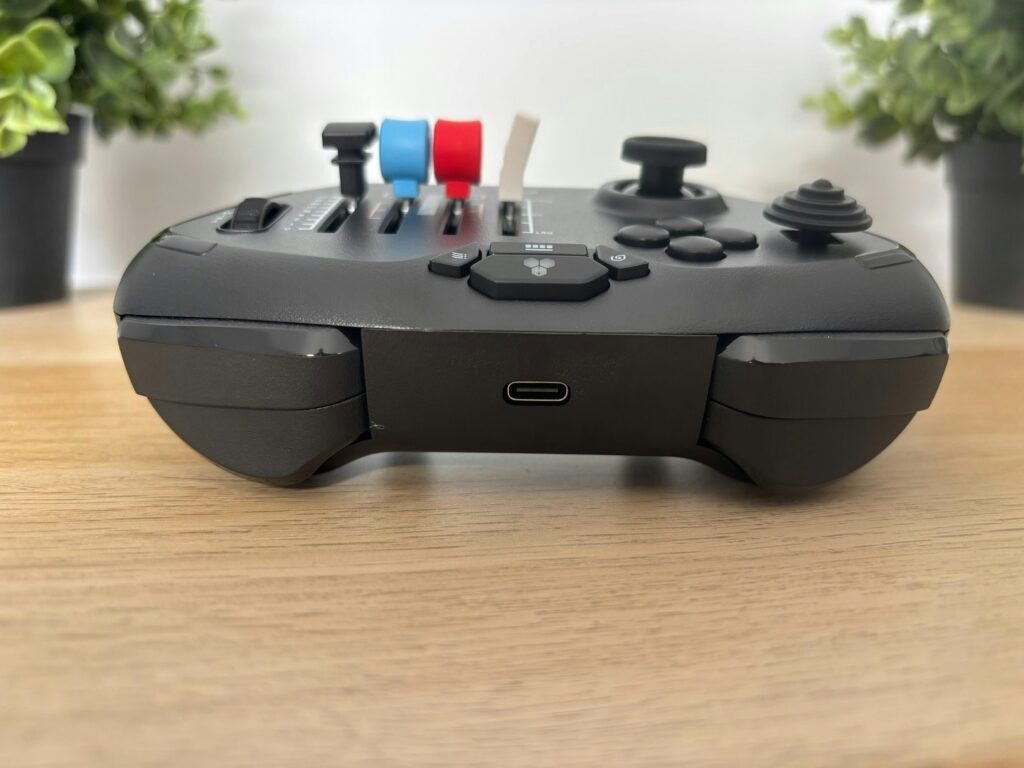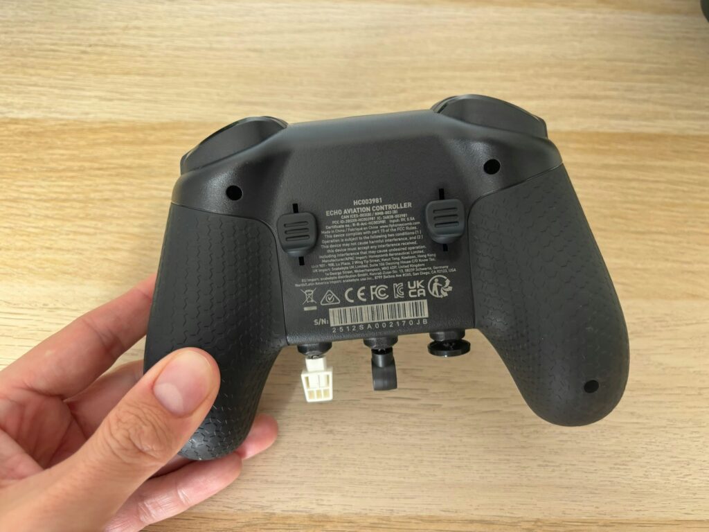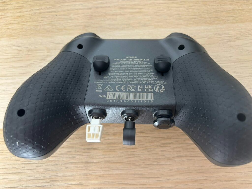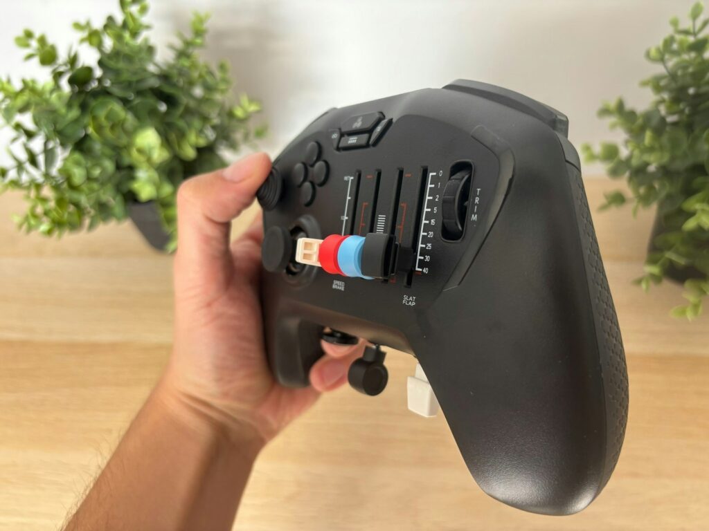 Em termos de quantidade de comandos, o Echo surpreende para um dispositivo tão compacto. Na frente, há quatro botões principais, dois sticks direcionais, quatro eixos, um trim wheel com feedback tátil satisfatório, botões de opção e um LED Honeycomb que indica o status do controle. Na parte superior, quatro shoulder buttons; atrás, um slider de leme; e, na frente, três destaques que fazem diferença no dia a dia: alavanca de flap, comando de trem de pouso e parking brake dedicados, algo raro em um gamepad.