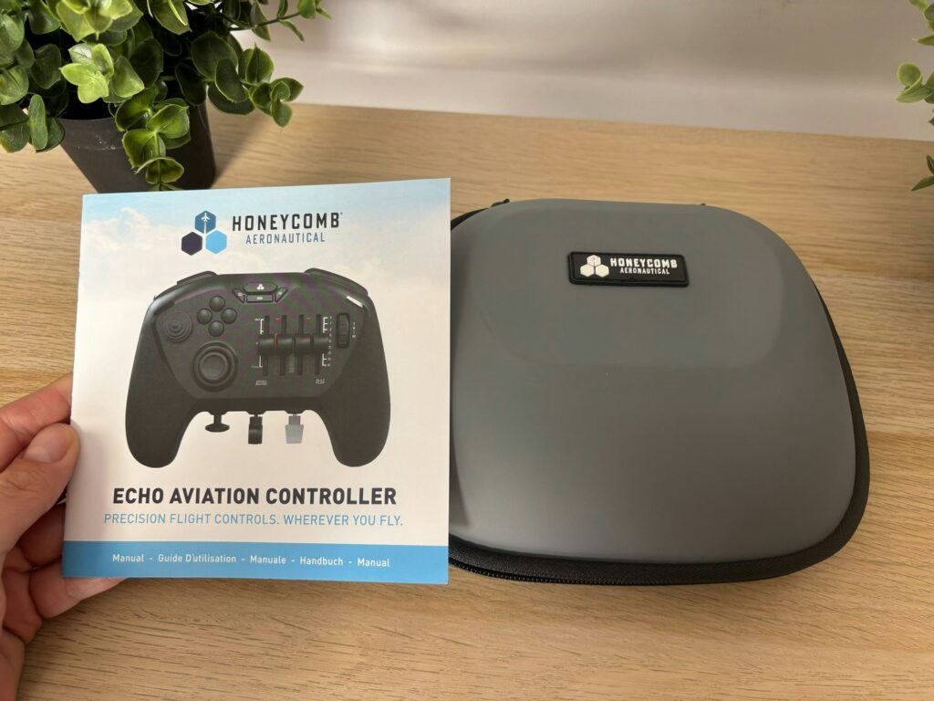 Logo na abertura da caixa, fica claro que a Honeycomb quer posicionar o Echo como produto premium portátil. O controle vem dentro de um estojo rígido cinza, com zíper robusto, espaço para o cabo USB-C de 1,2 m e para os módulos intercambiáveis de layout (GA, Airbus e Boeing). É o tipo de detalhe que facilita a vida de quem leva o sim na mochila, seja para um notebook gamer ou setup secundário.