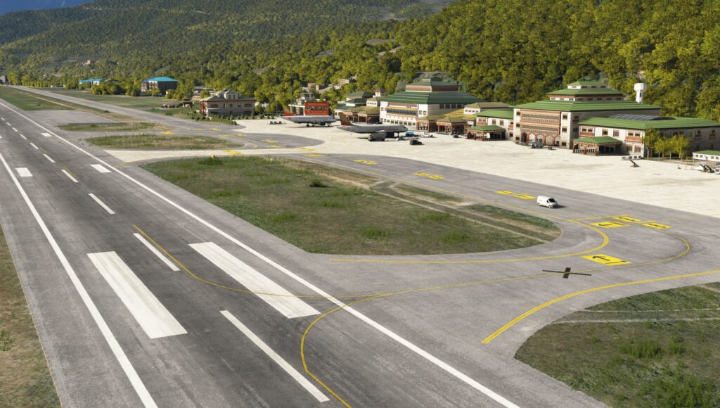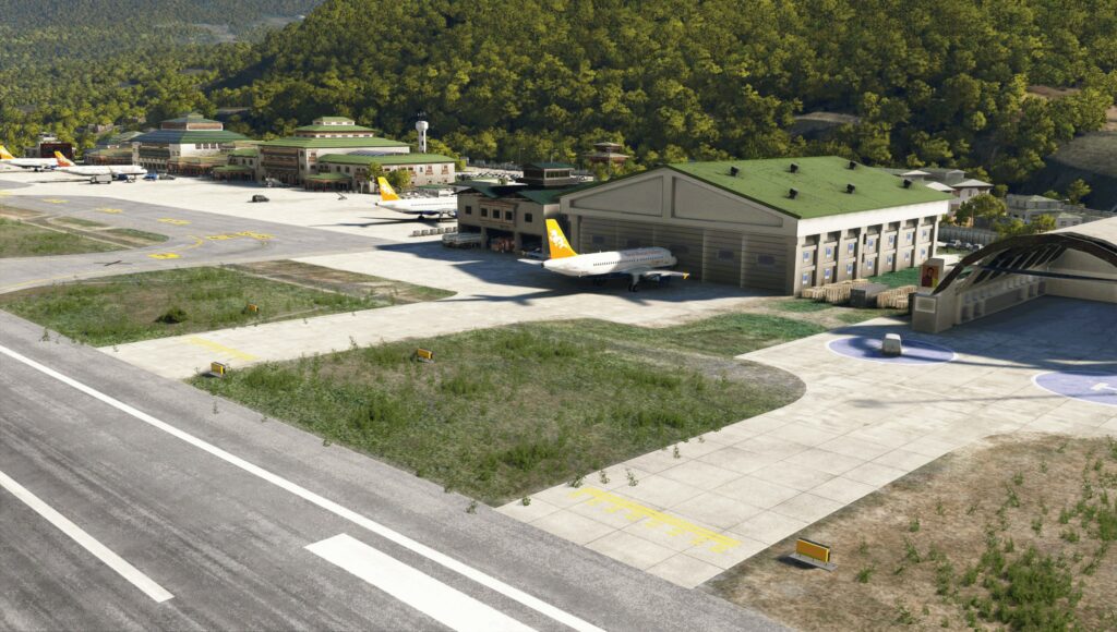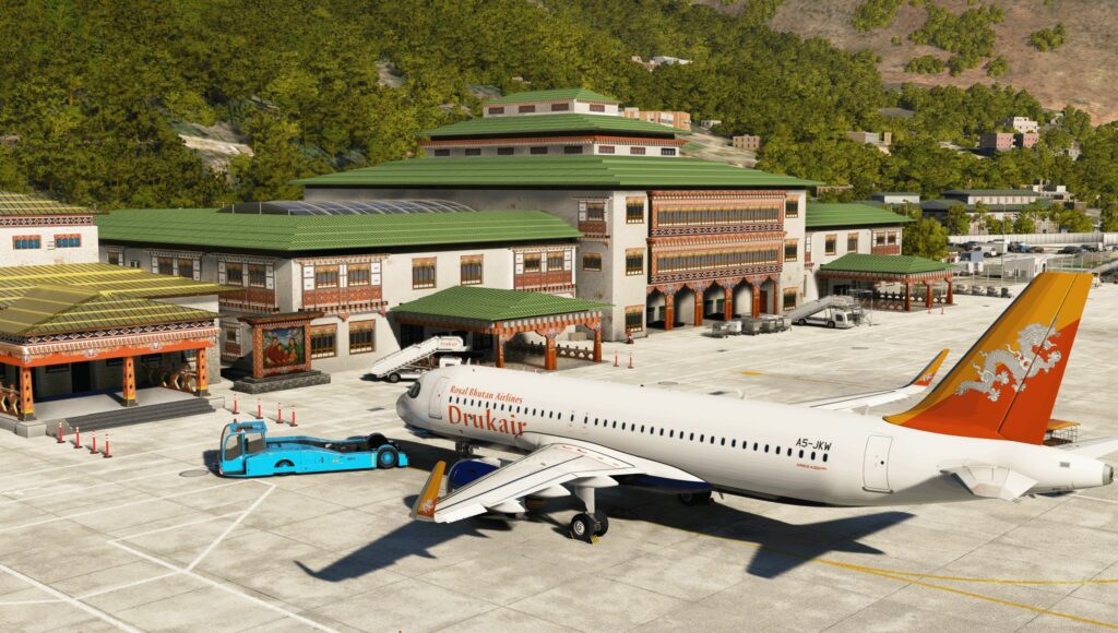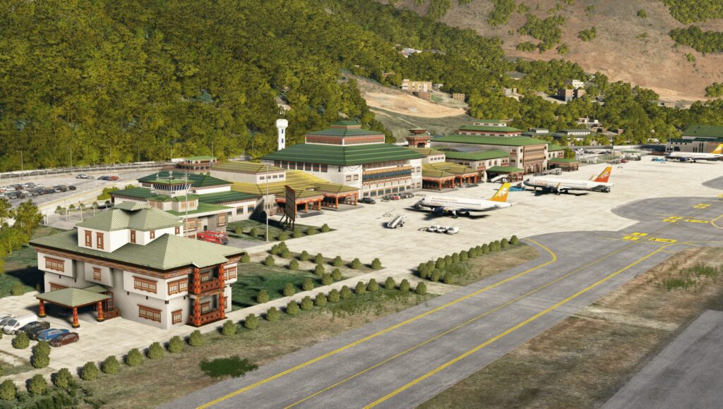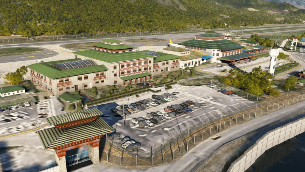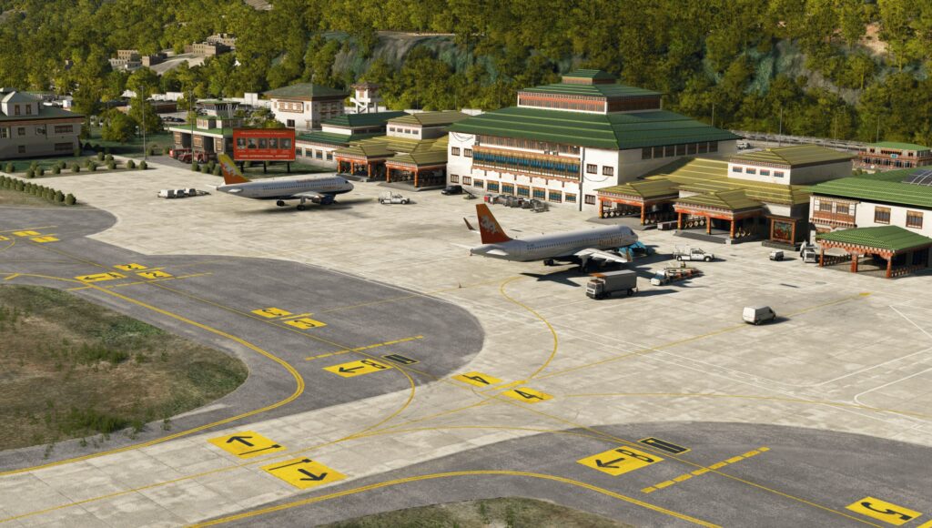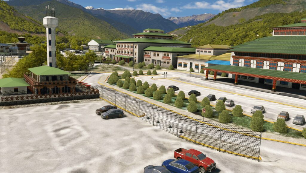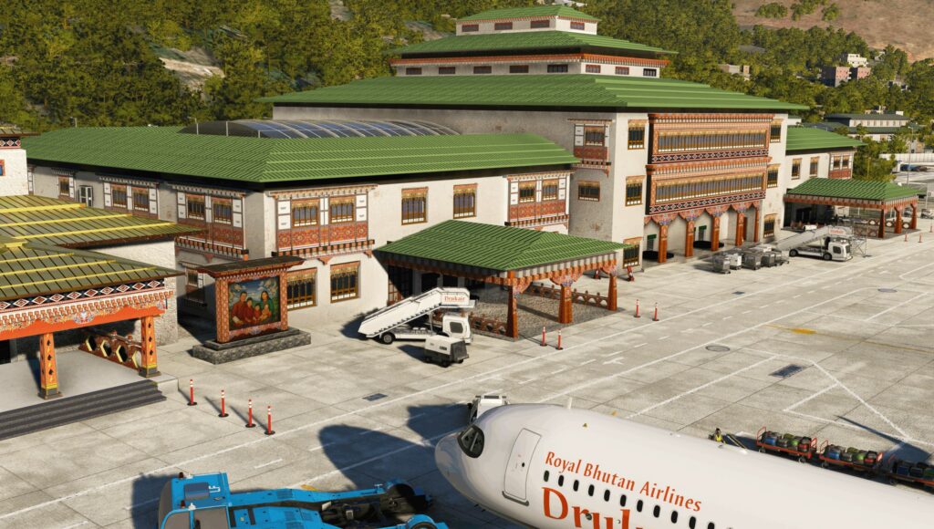 Os visuais são impressionantes, utilizando texturas PBR (Physically Based Rendering) completas em todas as superfícies, o que garante um realismo visual sem precedentes. O pátio do aeroporto está repleto de veículos estacionados e outros elementos que adicionam autenticidade ao cenário, criando uma experiência imersiva para o piloto virtual. Cada detalhe, desde as marcações do solo até os elementos decorativos butaneses, foi reproduzido com precisão.