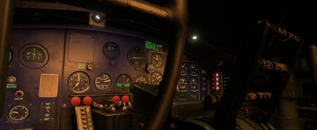 No lado dos sistemas, a atualização traz à vida o APU, apelidado de “Putt Putt” pelos tripulantes da época, agora totalmente funcional. A cabine também ganha um salto de imersão com iluminação interna e luzes UV nos instrumentos, recriando aquele brilho característico dos painéis de guerra em operações noturnas ou de baixa visibilidade. Para quem gosta de longos voos em clima ruim, isso muda bastante a sensação de estar realmente dentro de um bombardeiro da Segunda Guerra.