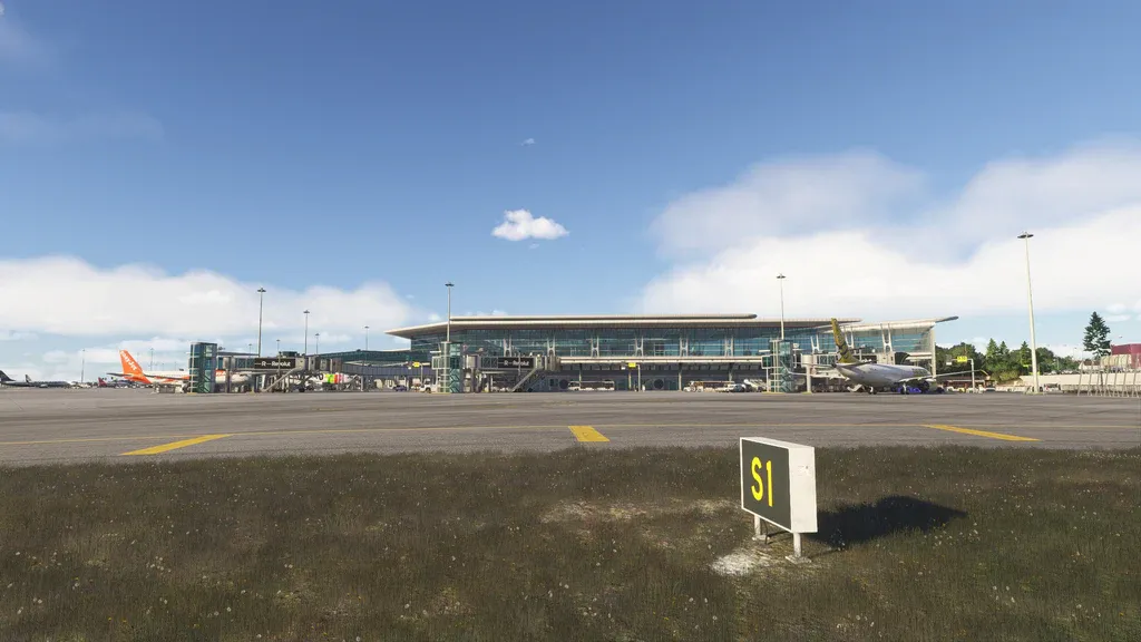 No conjunto, o cenário é visualmente muito agradável. A modelagem dos prédios principais é caprichada, com volumes, estruturas e detalhes coerentes com o aeroporto real. A MK Studios usa uma combinação de materiais em 1K e 2K, suficiente para manter boa definição em vista próxima sem matar desempenho, dentro do padrão atual de cenários comerciais. Em algumas áreas de rampa de aviação geral, o tiling de textura fica mais evidente, mas sem chegar a estragar a experiência. As marcações de solo são nítidas, porém o amarelo escolhido parece mais pálido e envelhecido do que o tom mais escuro e “federal standard” visto em vídeos recentes do aeroporto, que mostram linhas bem mais novas e limpas.