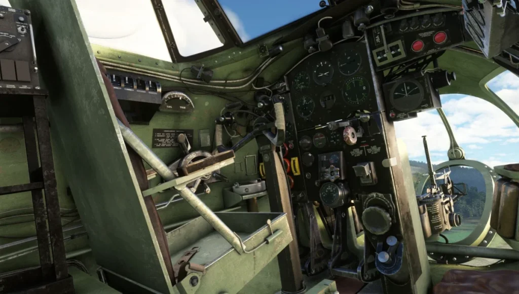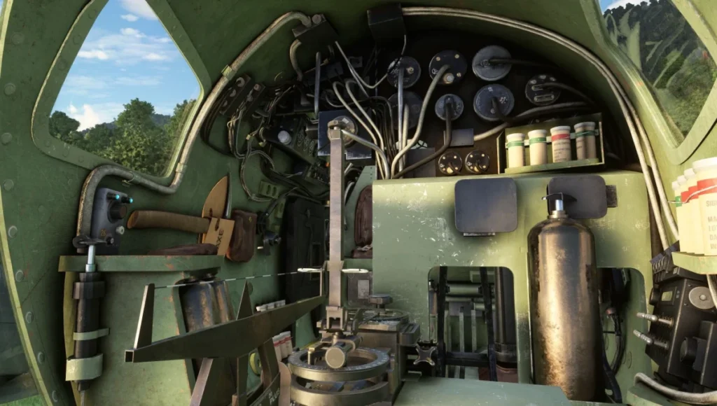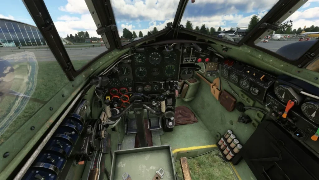 Em vez de um menu externo genérico, a Aeroplane Heaven colocou um painel de opções físico dentro do cockpit, acionado por uma chave à esquerda do painel de instrumentos. Por ali é possível ocultar completamente o piloto virtual, alternar o copiloto entre sentado, removido ou na posição de bombardeiro, além de controlar os exhaust flame guards (hush kits). Com os hush kits desligados, os escapamentos ficam expostos e surgem chamas aleatórias, algo pensado para quem quer recriar missões noturnas com mais autenticidade. Também dá para remover os capôs dos motores para inspeção visual dos Merlin, embora o simulador recoloque as tampas automaticamente assim que a aeronave se move.
