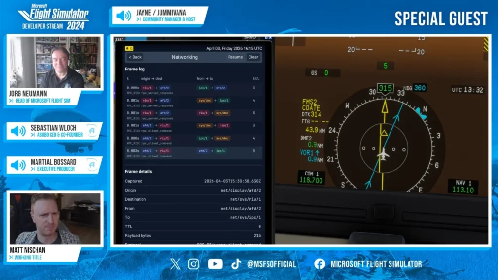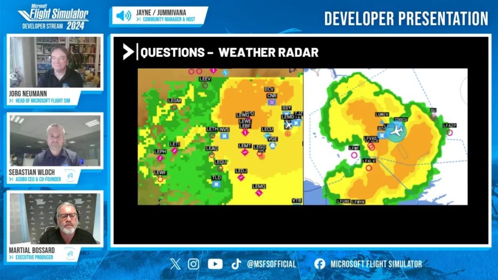 No campo técnico, Sebastian Wloch detalhou um upgrade importante no weather radar, agora com simulação realista de tilt e controles mais finos para desenvolvedores, além de melhorias na modelagem de turbulência, incluindo comportamento mais crível dentro de nuvens de tempestade e um modelo de esteira de turbulência mais fiel. Ele também foi transparente sobre o limite estrutural do live weather: tudo é baseado em modelos preditivos de cerca de seis horas, não em dados em tempo real, o que significa que discrepâncias locais com o clima real vão continuar existindo por natureza do sistema.