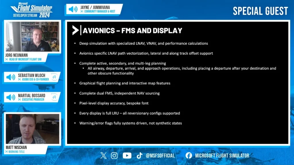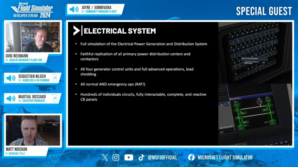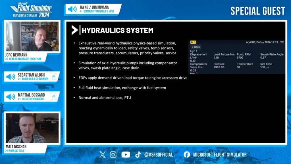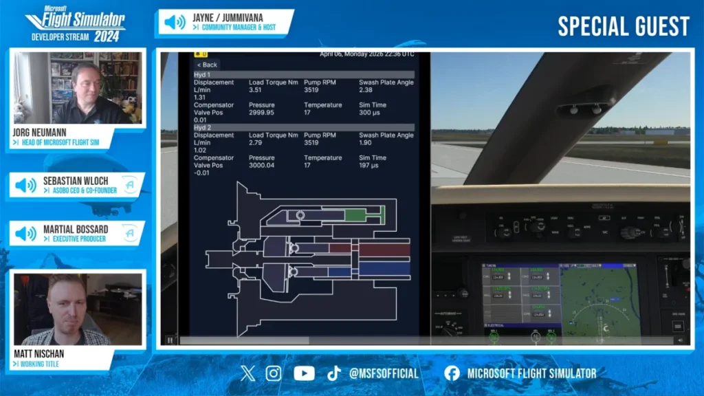 O ponto mais técnico da stream foi o detalhamento do Embraer Praetor 600, fruto da parceria oficial com a Embraer. Matt Nischan, da Working Title, deixou claro que o objetivo é ir fundo: sistema elétrico completo até o nível de disjuntores, hidráulica com simulação física de aquecimento de fluido e compressão de acumuladores, e um novo modelo de turbina baseado em dados de engenharia de white papers, não em aproximações genéricas. Os dois FMS serão totalmente independentes, e o IRS terá drift calculado por equações reais de navegação inercial, em vez de offsets aleatórios.