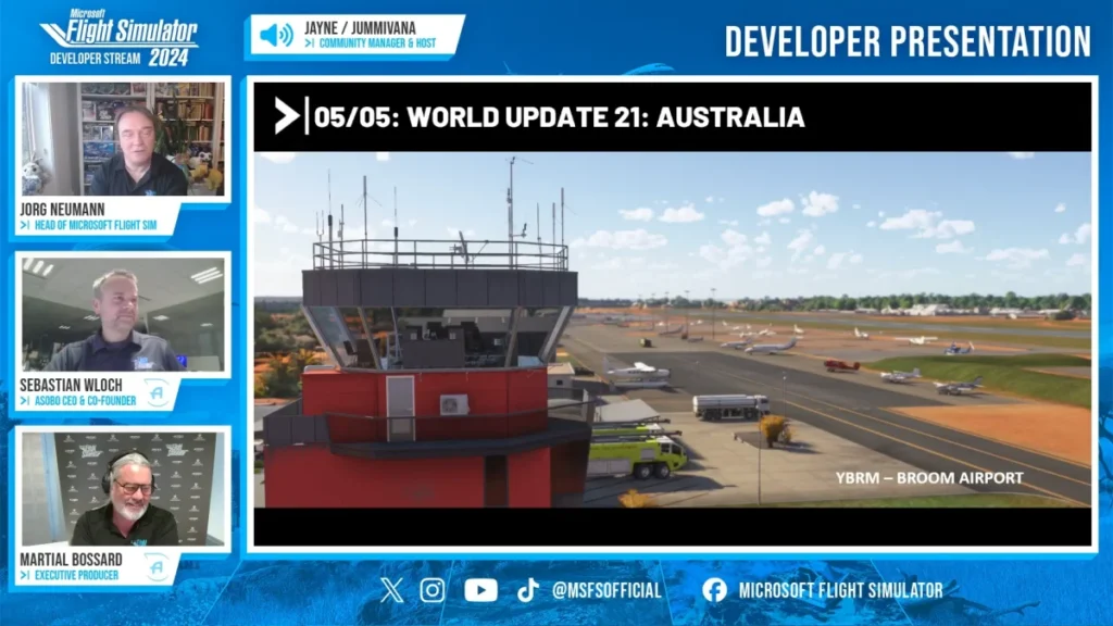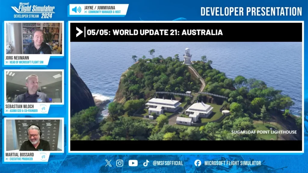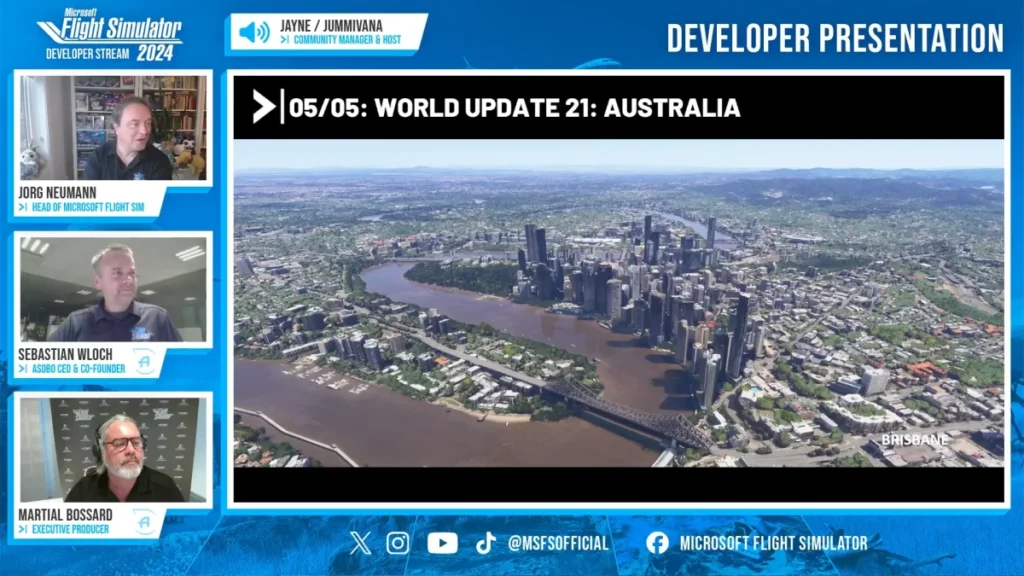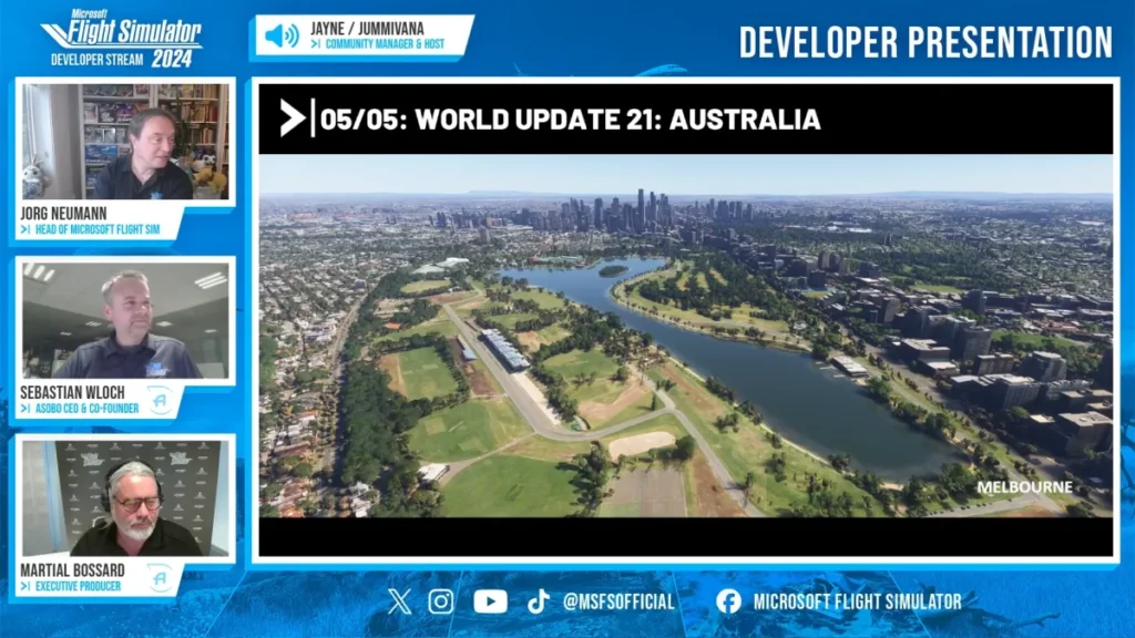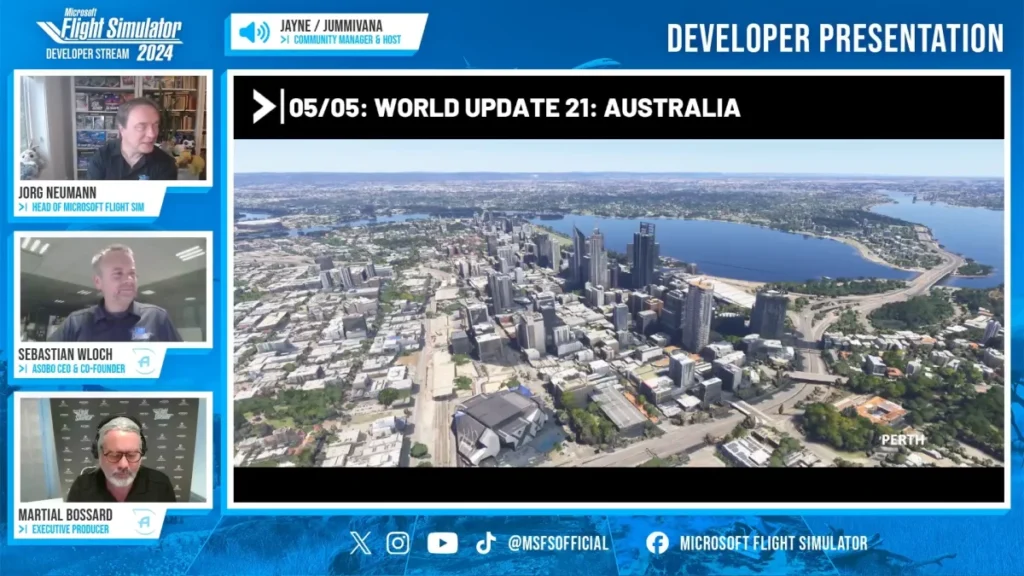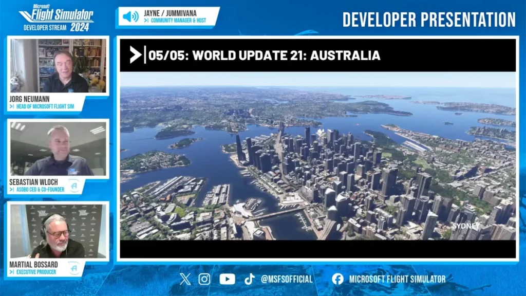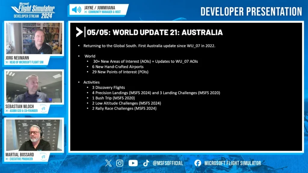 World Update 21 foi anunciada com foco total na Austrália e data marcada: 5 de maio. Segundo Jörg, é uma das maiores WUs em termos de conteúdo, trazendo 30 novos pontos de interesse e revisões em cerca de 10 áreas já trabalhadas na World Update 7. Além disso, chegam seis aeroportos handcrafted, novos discovery flights, bush trips, pousos de precisão e rotas em vales pensadas para explorar o relevo australiano. Para quem gosta de VFR e turismo virtual, é o tipo de pacote que muda a lista de destinos favoritos.