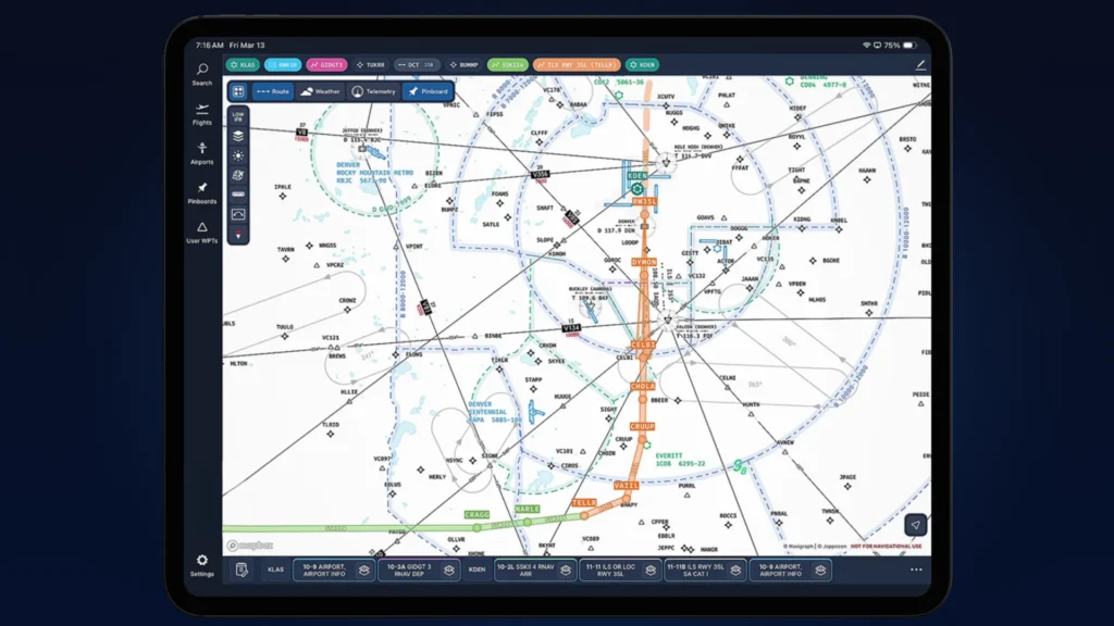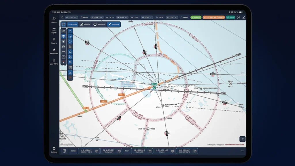 Complementando os feathers, o recurso de Extended Runway Centerlines projeta o eixo da pista para fora do aeroporto diretamente no mapa. É aquele prolongamento visual do alinhamento que muitos já estão acostumados a ver em ND de aeronaves complexas, agora disponível de forma clara no Navigraph Charts.