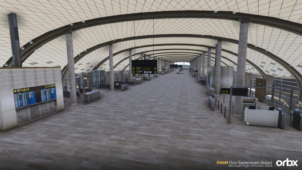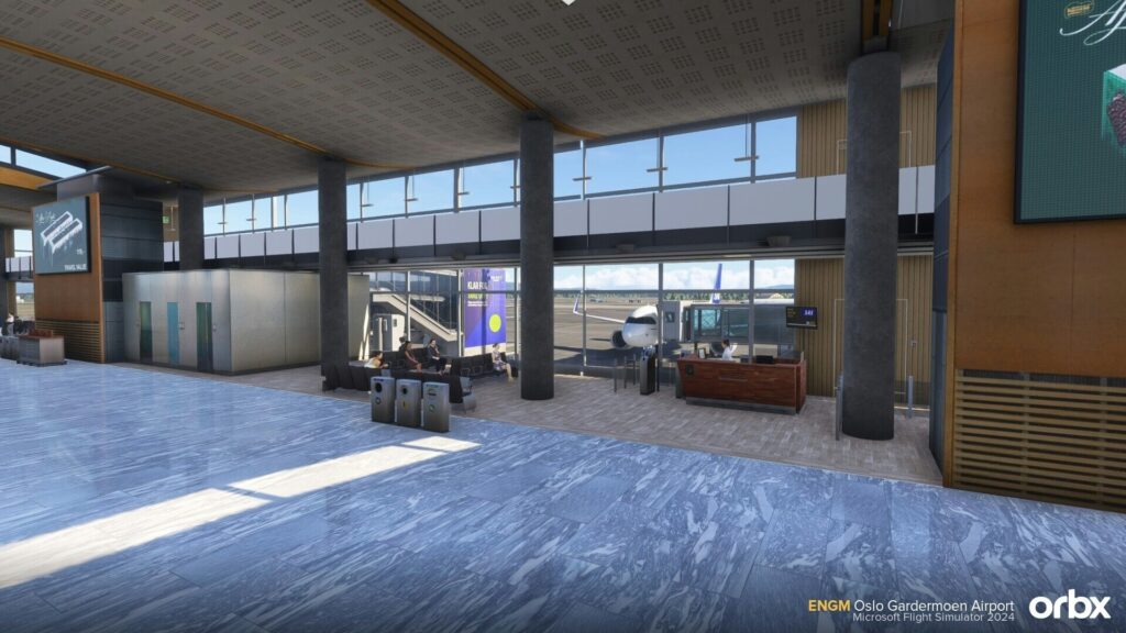O destaque do pacote é a modelagem do terminal principal, incluindo interior visível, algo que virou praticamente obrigatório em cenários payware de grande porte no MSFS 2024. A Orbx promete um terminal interno detalhado, com áreas de check-in e embarque representadas, o que ajuda bastante na imersão durante taxi, pushback e operações em baixa velocidade, quando o piloto realmente percebe o nível de acabamento.