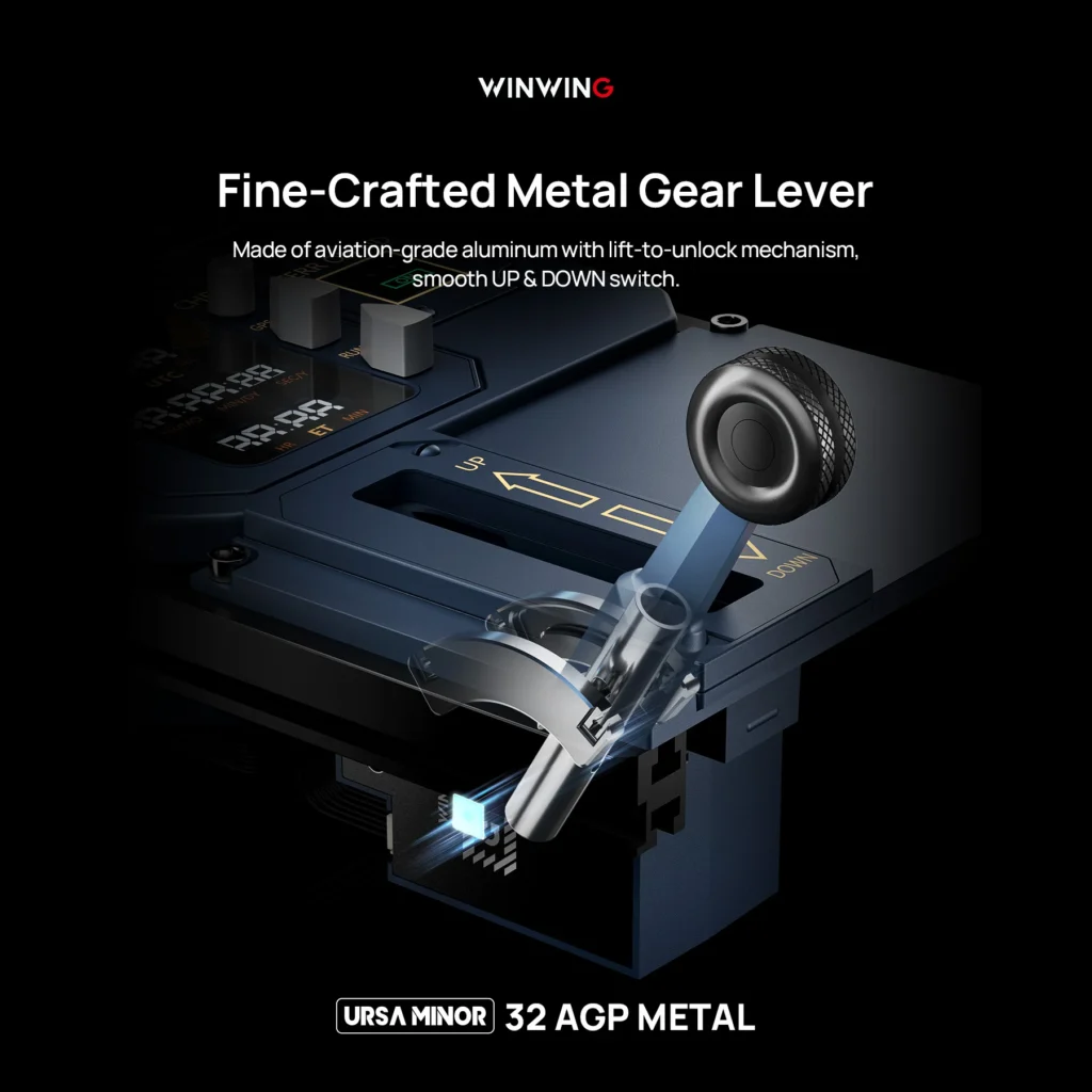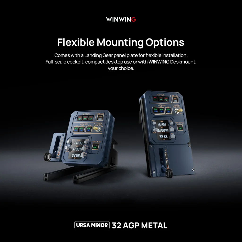 Para os simuleiros que buscam o máximo de realismo tátil, a Winwing apresenta o AGP 32 Metal. Como o nome sugere, este módulo é construído quase inteiramente em metal, oferecendo uma experiência robusta e fiel ao hardware de um cockpit real. Ele é dedicado ao controle do trem de pouso e outros sistemas da aeronave.