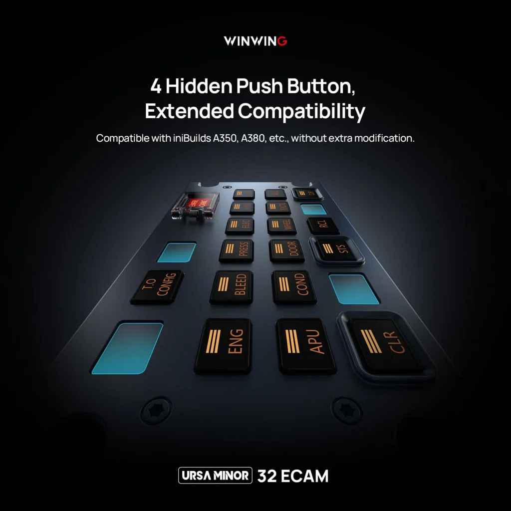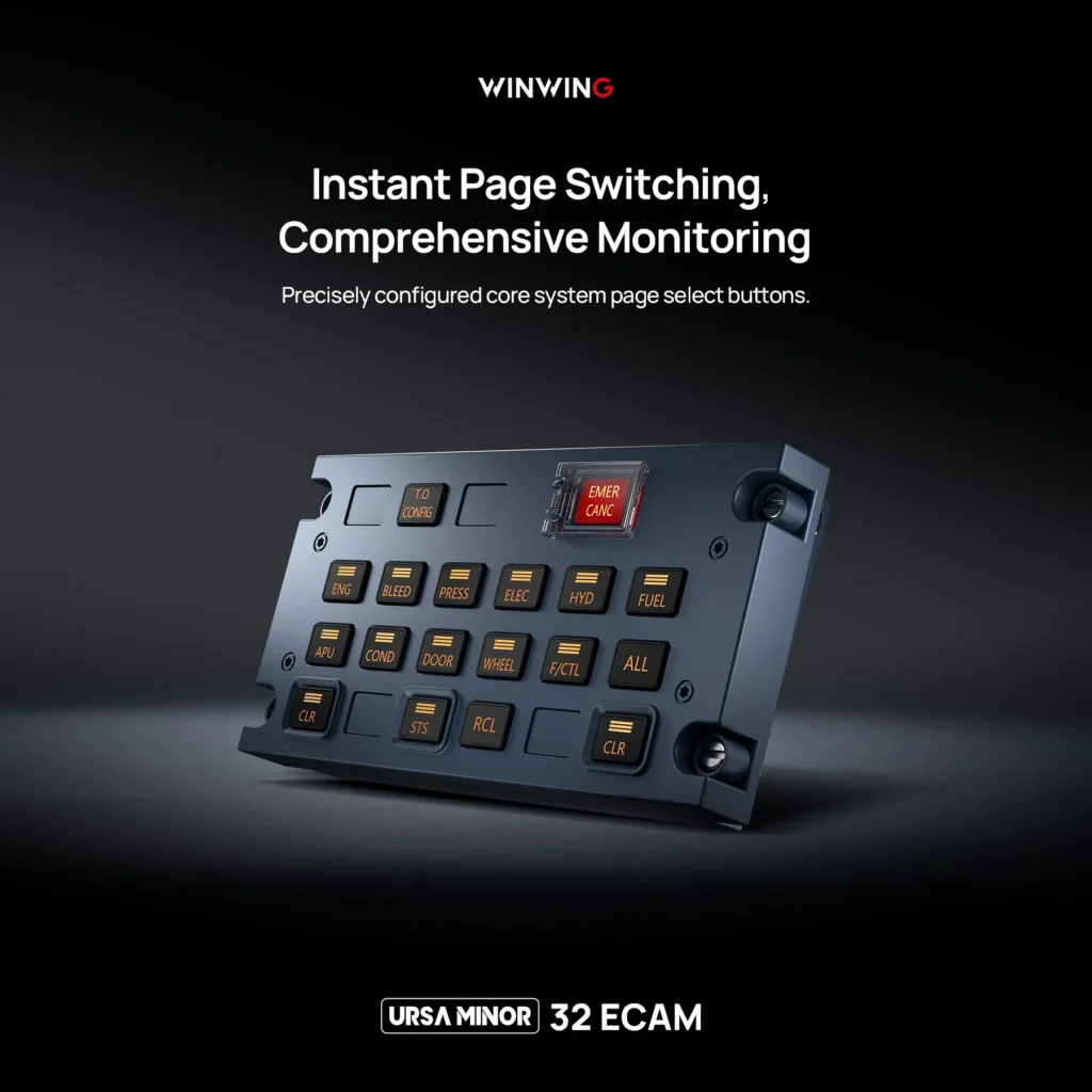 O Winwing ECAM 32 foi projetado como um painel de controle multifuncional compacto, inspirado diretamente no Electronic Centralized Aircraft Monitor (ECAM) da Airbus. Este módulo de peça única é ideal tanto para uso em uma mesa quanto para integração em um setup de cockpit mais complexo.