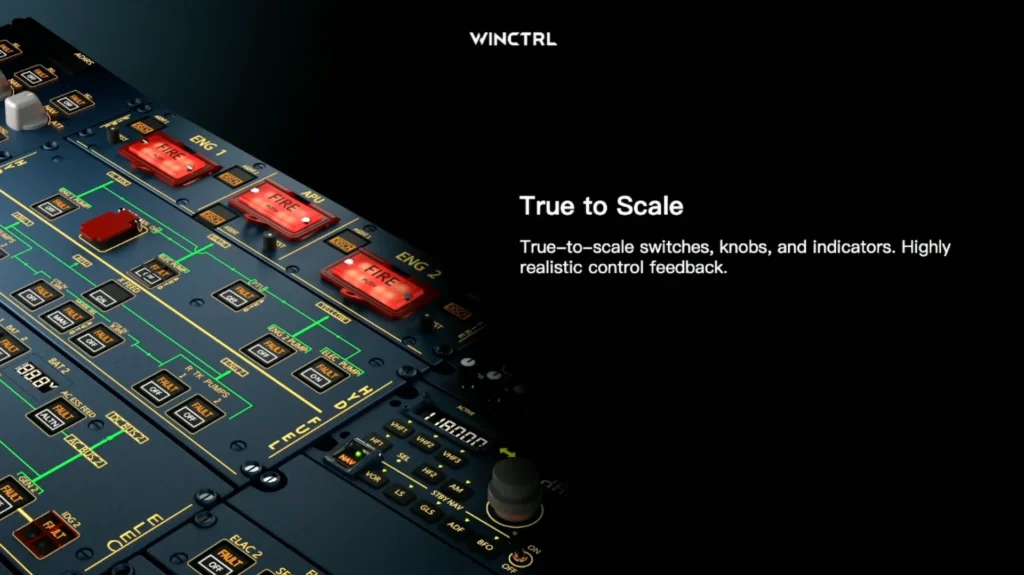 As imagens apresentadas no evento mostram um painel que replica o overhead completo do A320, desde a parte superior com os fire handles de motor e a seção de APU, passando por elétrico, hidráulico, combustível, pressurização, flight controls, anti-ice e iluminação, até chegar aos controles de wiper e rain repellent na parte inferior. A proposta é entregar um layout fiel ao real, com botões, knobs e indicadores em escala correta e feedback tátil que lembre o cockpit de linha aérea.