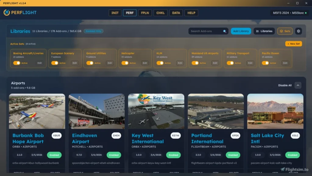 No gerenciamento de biblioteca, o app oferece visualização em cards ou tabela, filtros por categoria e desenvolvedor, miniaturas personalizáveis e, principalmente, a criação de Sets reutilizáveis. Esses conjuntos permitem agrupar addons por tipo de operação – por exemplo, um set VFR com aviões leves e cenários regionais, e outro IFR focado em airliners, GSX e grandes hubs – e ativar tudo de uma vez com um único toggle, sem ficar marcando item por item.