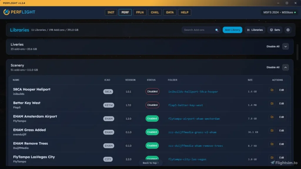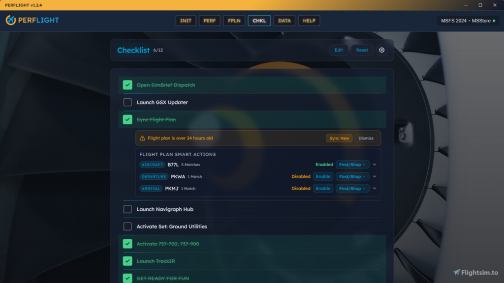 O recurso mais interessante do pacote é o chamado Smart Actions. Quando você sincroniza um plano de voo do SimBrief, o PERFLIGHT lê origem, destino e aeronave e cruza essas informações com a sua biblioteca de addons. Se detectar que você tem um cenário ou avião específico para aquele voo, o app sugere ativá-los com um clique; se não encontrar nada instalado, oferece atalhos de busca em flightsim.to, iniBuilds e Contrail para você caçar rapidamente um addon compatível.