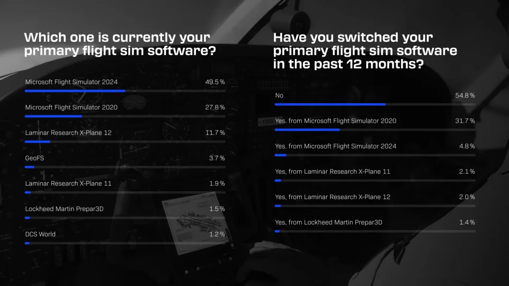 No universo de addons, a pesquisa confirma o que muitos já percebiam no dia a dia. No MSFS, o Fenix domina com 42,4% de preferência, seguido de perto pela PMDG, que aparece com 31,5% e 23,3% em seus diferentes produtos, e pela iniBuilds, com 15,7%. É um cenário que consolida o trio como referência de alta complexidade dentro do simulador da Microsoft, especialmente para quem busca operações IFR mais profundas.