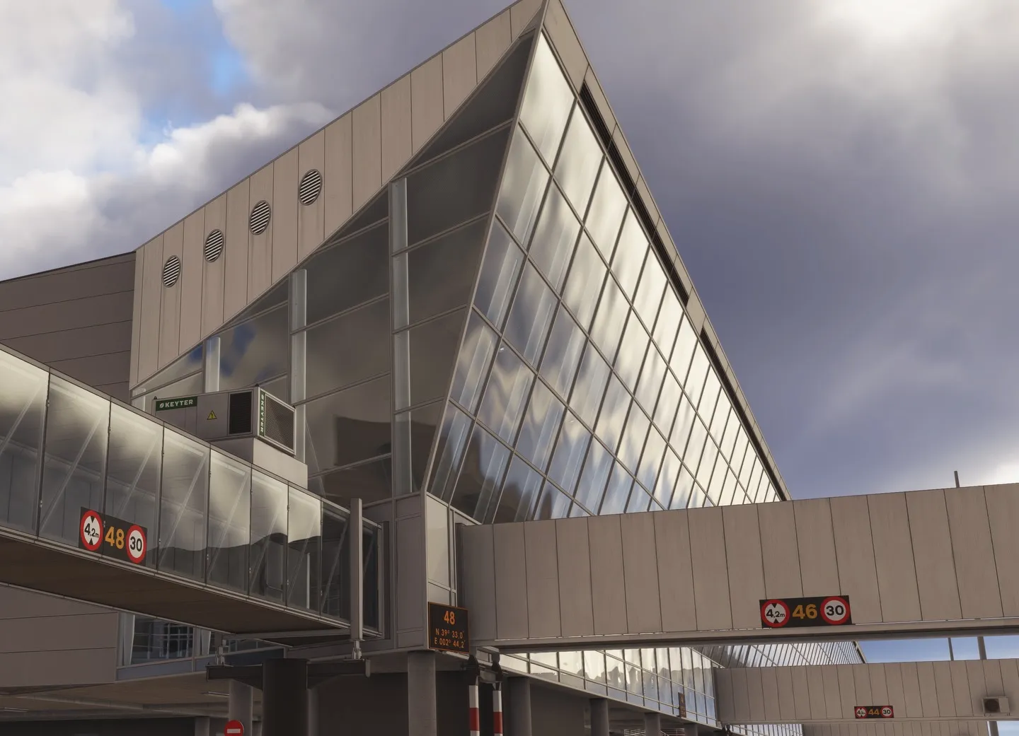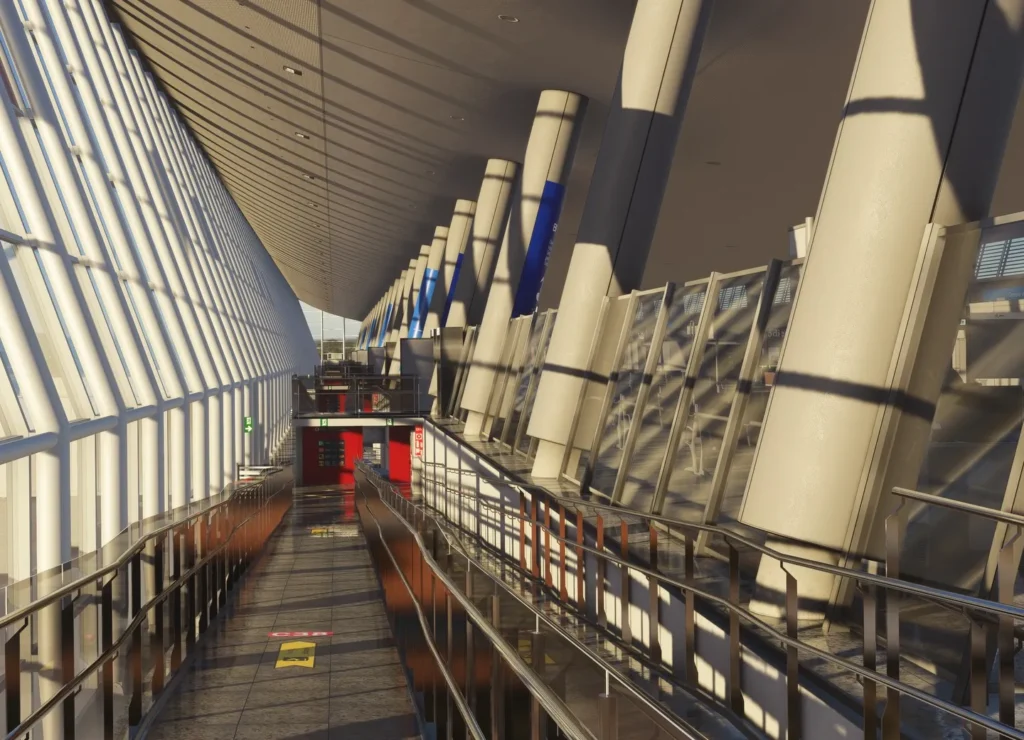 As screenshots divulgadas focam tanto em áreas externas quanto internas do aeroporto, com atenção especial ao PMI Module C, incluindo os portões C38–C41 e C44–C48. É possível notar modelagem complexa de estruturas, passarelas, fachadas envidraçadas e elementos de solo que ajudam a dar vida ao ambiente, algo que já virou marca registrada da Pyreegue em outros projetos para MSFS.