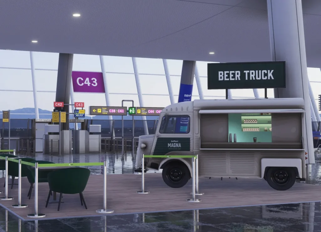 No interior, o estúdio parece seguir a mesma filosofia de alta fidelidade, com salas de embarque detalhadas, mobiliário, iluminação e texturas que remetem bem ao terminal real. Para quem gosta de operações imersivas, especialmente em voos de companhias europeias de baixo custo que lotam Palma de Mallorca na alta temporada, esse tipo de cuidado visual tende a fazer bastante diferença na experiência geral.