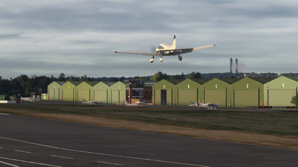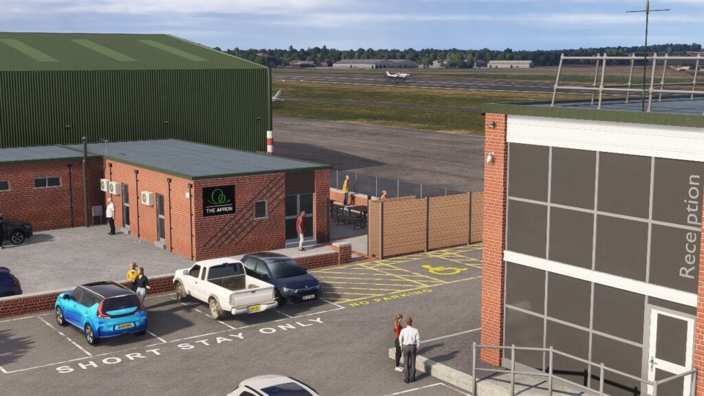 Um dos pontos de atenção do pacote é o tratamento dado à pista e às taxiways. As texturas foram retrabalhadas com marcas personalizadas, desgaste visível e sinalização de solo condizente com o aeroporto real, algo que faz diferença em aproximações baixas e durante o rolagem na decolagem. A sinalização de aeródromo foi ajustada para refletir a realidade de EGNE, o que é particularmente útil para quem gosta de seguir cartas e procedimentos com precisão.
