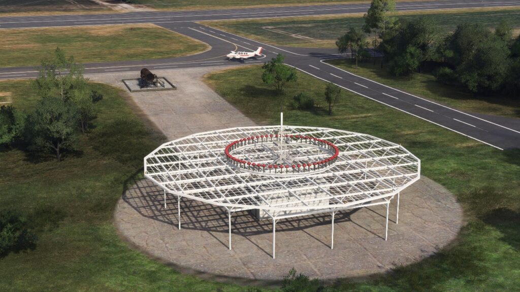 O ambiente em solo é preenchido com centenas de assets posicionados manualmente, incluindo bombas de combustível, cercas, veículos de apoio, equipamentos de solo e até espectadores, compondo um cenário que foge do aspecto genérico padrão do simulador. O tráfego de solo localizado e a desordem típica de um aeródromo movimentado ajudam a dar vida ao campo, especialmente em operações de táxi e durante o tempo em solo entre um voo e outro.