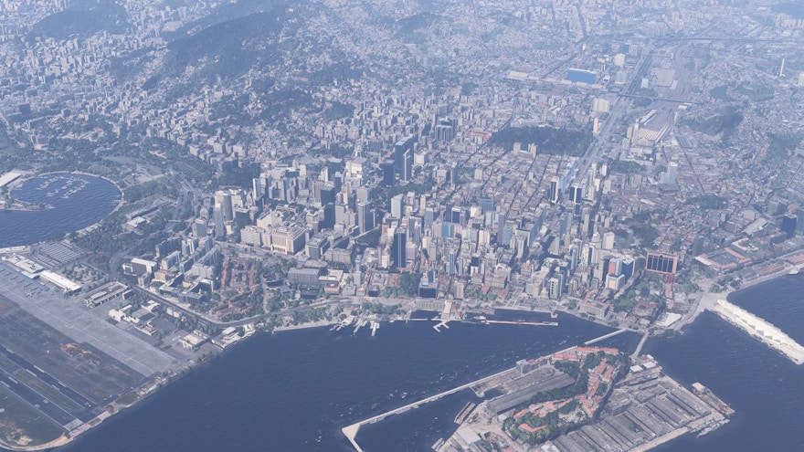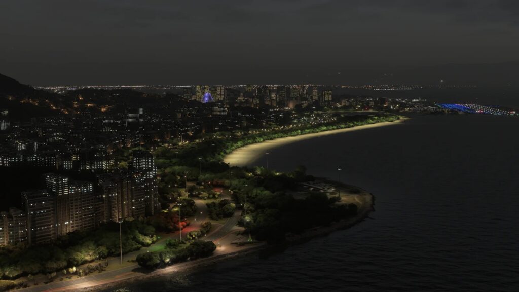 Além dos prédios, o pacote adiciona marinas customizadas, barcos e iluminação de praia, elementos que fazem diferença quando se voa baixo pela costa ou se aproxima visualmente de Santos Dumont. Esses detalhes ajudam a quebrar a aparência genérica da fotogrametria e dos autogen padrão, aproximando mais o cenário do que o simmer brasileiro espera ver ao sobrevoar o Rio.