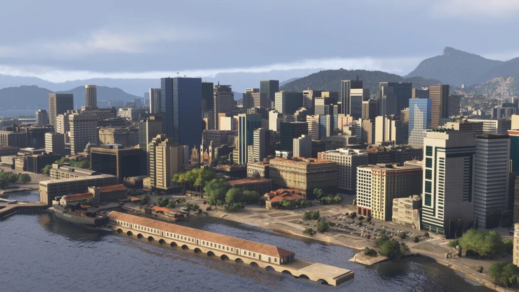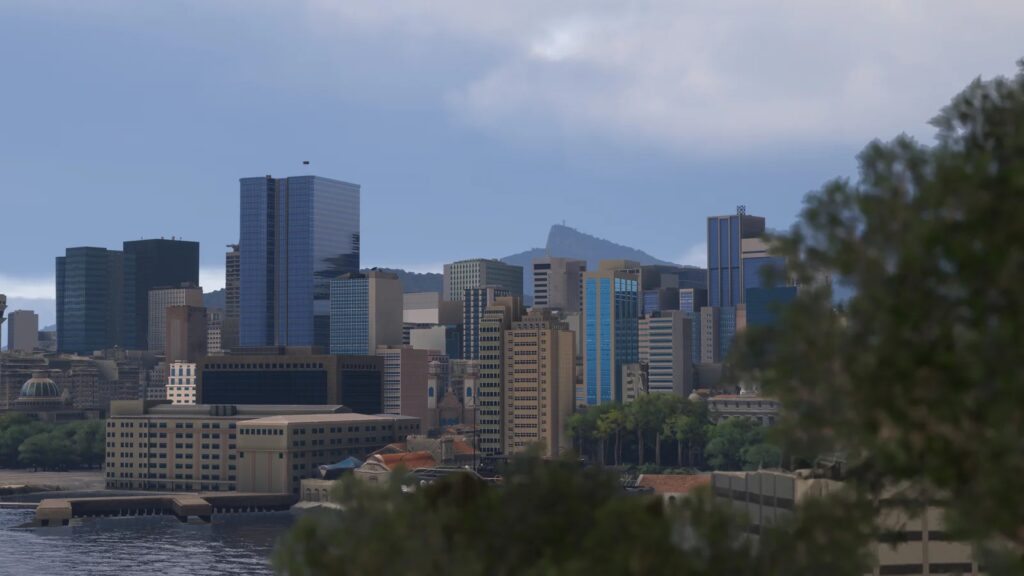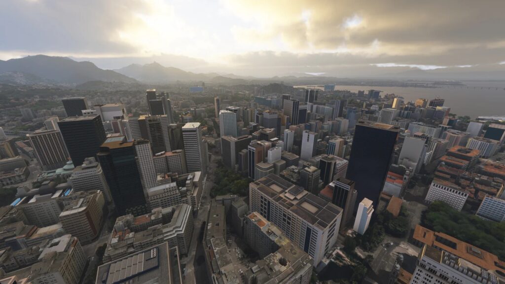 O Rio de Janeiro City Pack traz mais de 350 edifícios modelados à mão, substituindo boa parte das estruturas genéricas do simulador por versões customizadas. Isso inclui prédios icônicos e blocos urbanos que ajudam a compor melhor a silhueta da cidade, especialmente na região central e na orla. O uso de texturas PBR dá um ganho de realismo em reflexos, iluminação e sensação de profundidade, algo que se destaca em voos ao amanhecer ou entardecer.