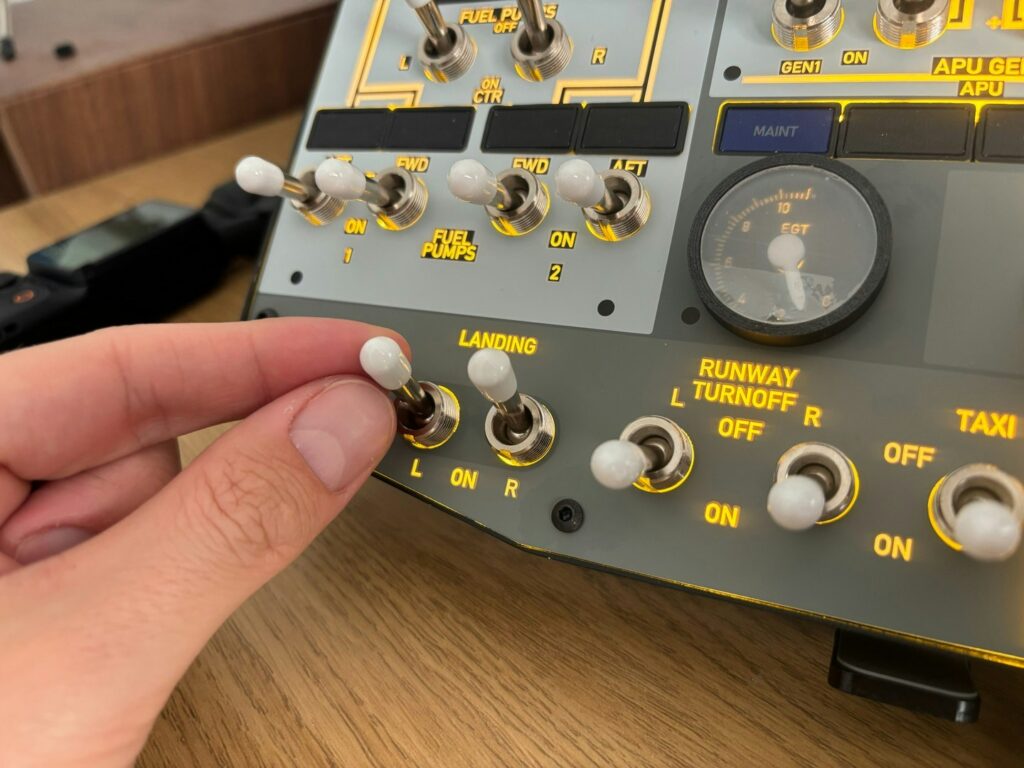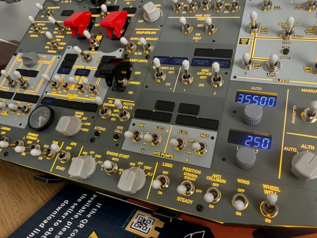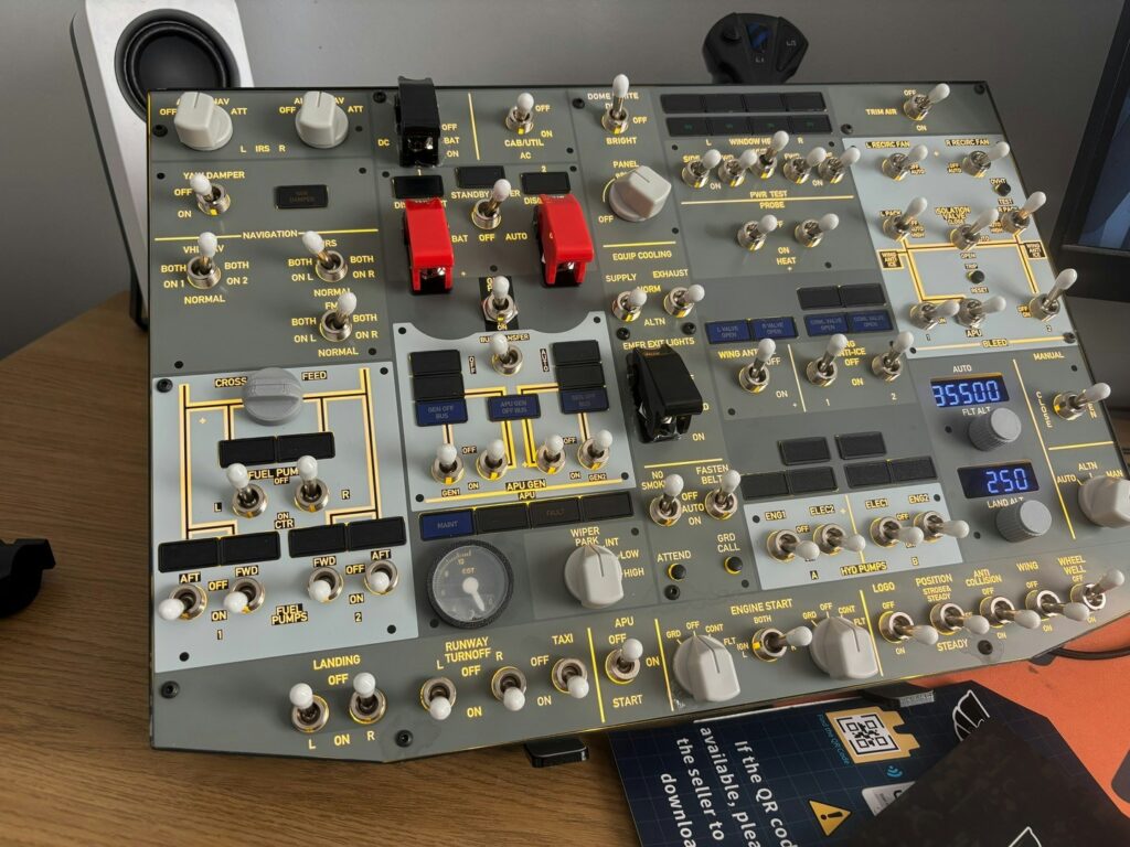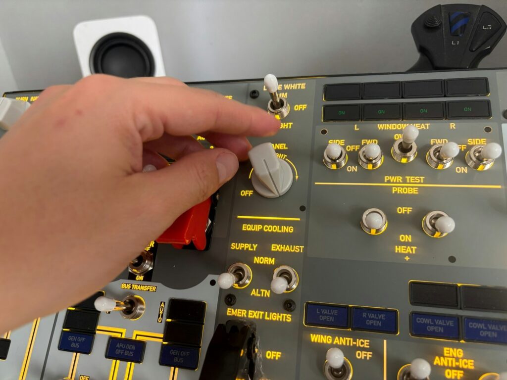 O problema é que, quando você começa a mexer nos controles, a ilusão de “cockpit profissional” desmancha rápido. São 58 switches, 10 knobs e 4 tampas de proteção em um corpo metálico de 2,8 kg, com dimensões bem próximas do overhead real. Só que a sensação ao toque é de plástico 3D printado barato, com folga excessiva em chaves e seletores, tampas de bateria e emergência totalmente em plástico e sem nenhum toggle com cara de Boeing de verdade, como os de landing lights. Para um produto vendido como topo de linha, o feeling é mais de protótipo de feira do que de peça definitiva.