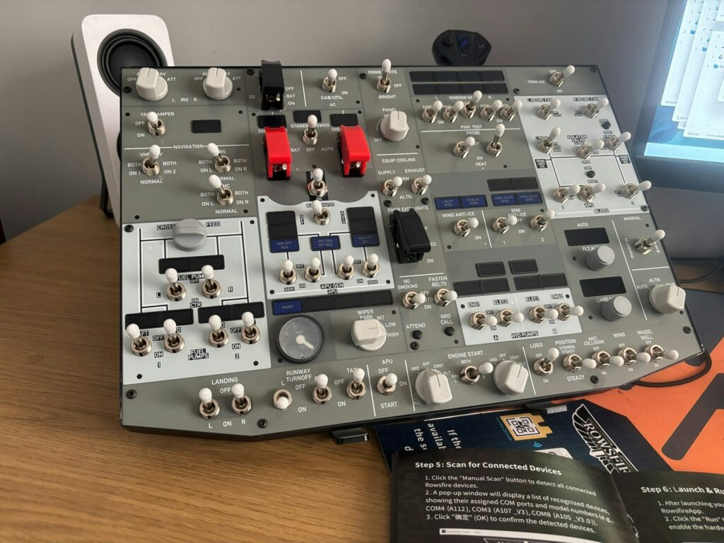 Se antes os produtos Rowsfire dependiam de MobiFlight e uma salada de links no Google Drive, agora o B107 usa software próprio da marca. O manual impresso é objetivo, e a configuração inicial leva poucos minutos. Nesse ponto, há um avanço real: plugou, configurou o perfil e o painel já conversa com PMDG 737, iFly 737 MAX e Zibo Mod sem sofrimento, tanto no MSFS quanto no X-Plane.