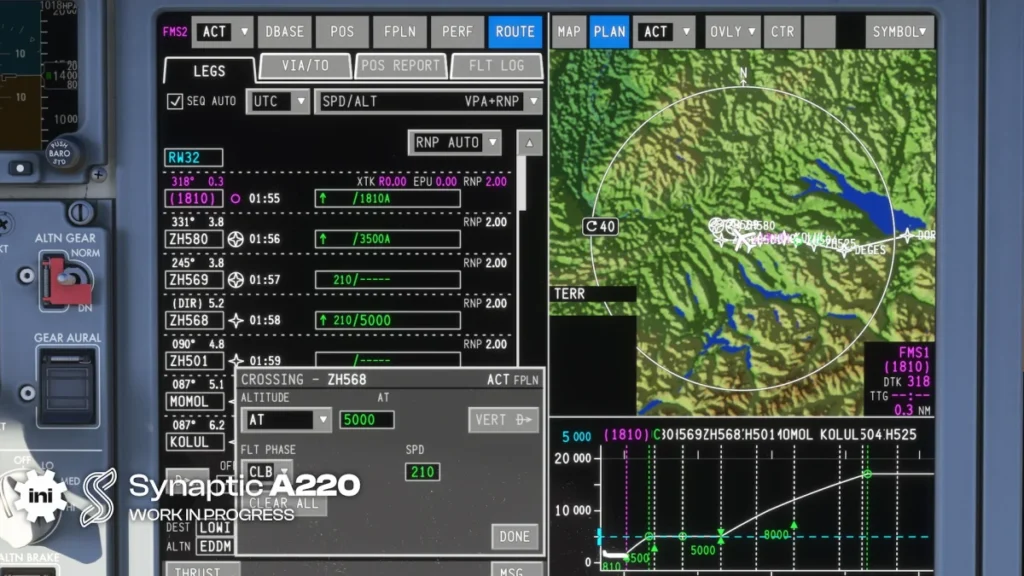 O FMS também foi reconstruído do zero, com ênfase em integração mais estreita com os demais sistemas, melhor performance e menor risco de erros fatais. Essa abordagem permitiu implementar comportamentos mais finos, como transferência automática nav-to-nav na aproximação e a transição de guiagem de DMC para PFCC durante o autoland. Em termos práticos, isso significa um fluxo de operação mais próximo do real, especialmente em fases críticas como descida e aproximação com restrições complexas.